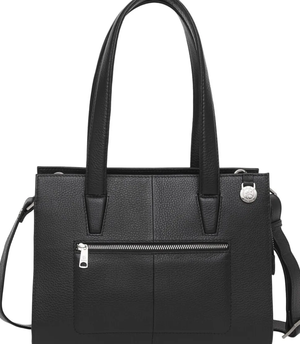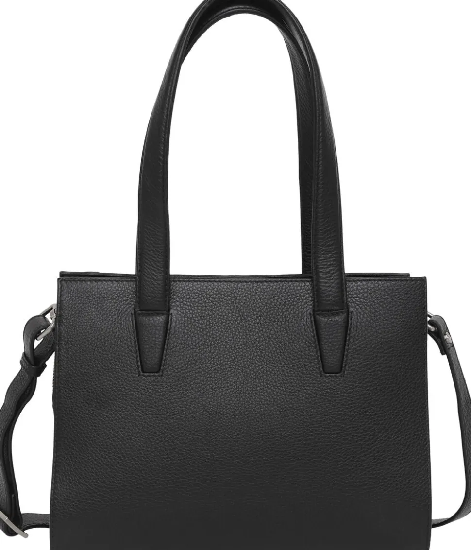 Elea håndtaske i Cormorano kalveskind. Tasken har to gode hanke samt en aftagelig skulderrem. Tasken lukkes i toppen af en lynlås. Inden i er tasken delt op i tre åbne rum og to store rum med lynlås. Ydermere er der en læderlomme til en mobil og lynlåslomme på inderside samt på lomme ydersiden. 28x21x14 cm