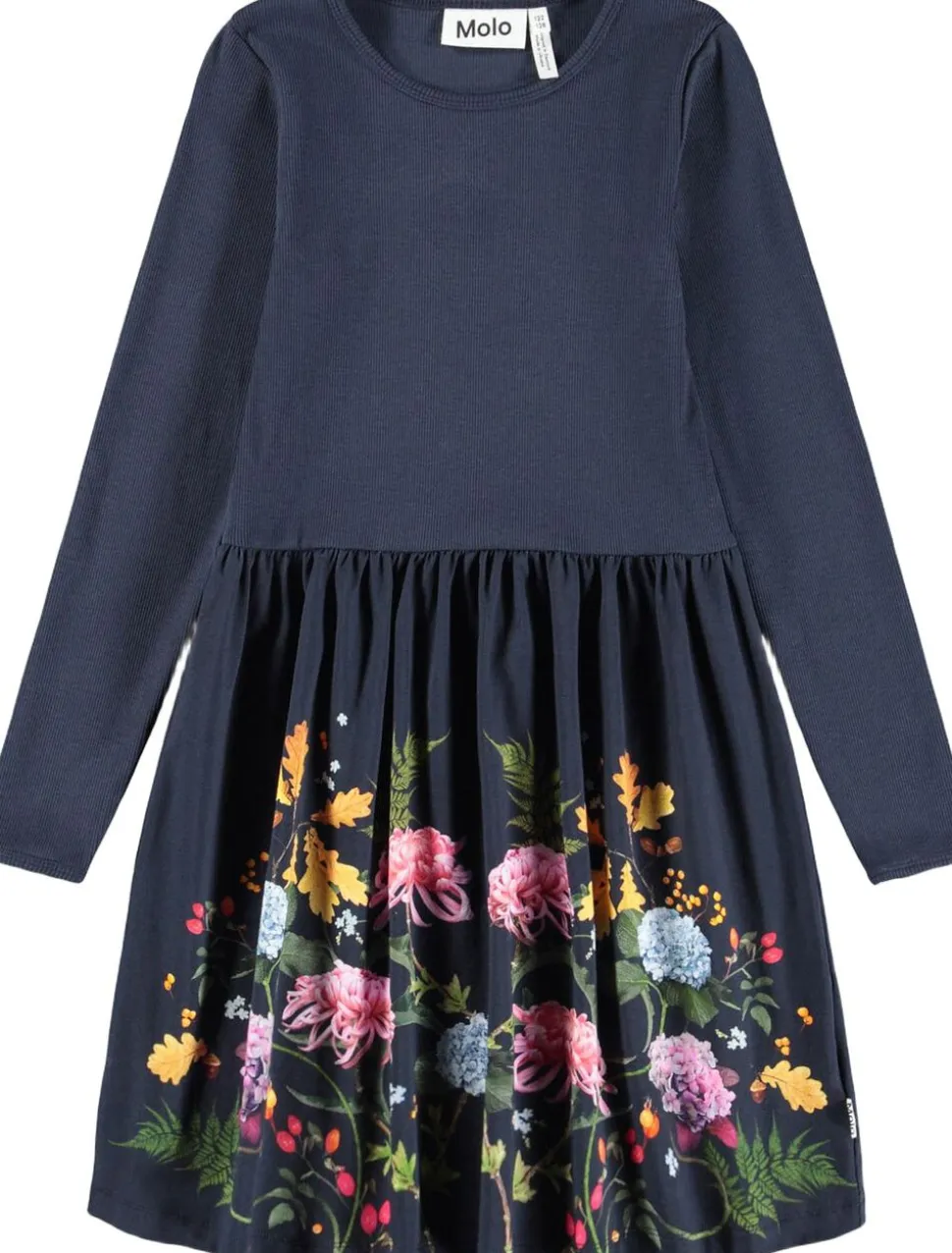 Denne mørkeblå langærmede kjole i økologisk bomuld fra Molo har en tætsiddende rib-jersey overdel og et skørt i glat jersey, der giver plads til leg og bevægelse. Kjolens skørt er prydet med et print af blomster og blade, og den er nem at få på.