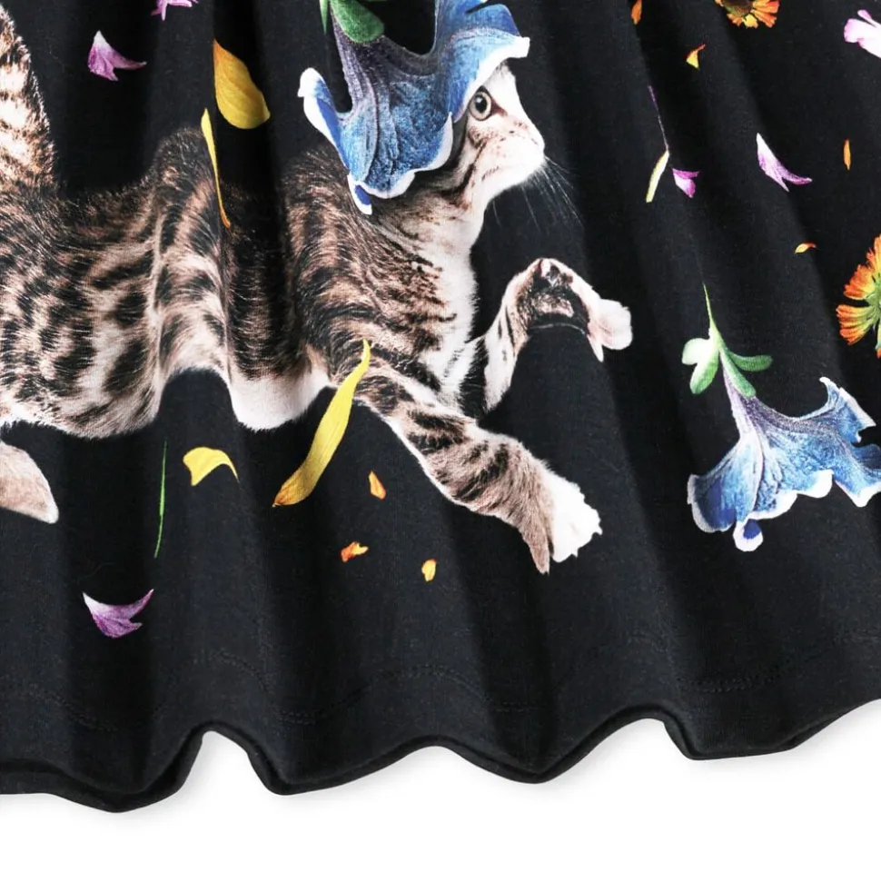 Langærmet kjole i blød bomuldsjersey. Overdelen har en tætsiddende pasform i ribbet stof, mens skørtet er lavet af strækbart jersey. Det farverige print af en kat i blomsterregn giver et legende udtryk. Kjolen er designet til at give børn god bevægelsesfrihed, hvilket gør den ideel til leg og afslapning. Komfort og stil går hånd i hånd i denne kjole.