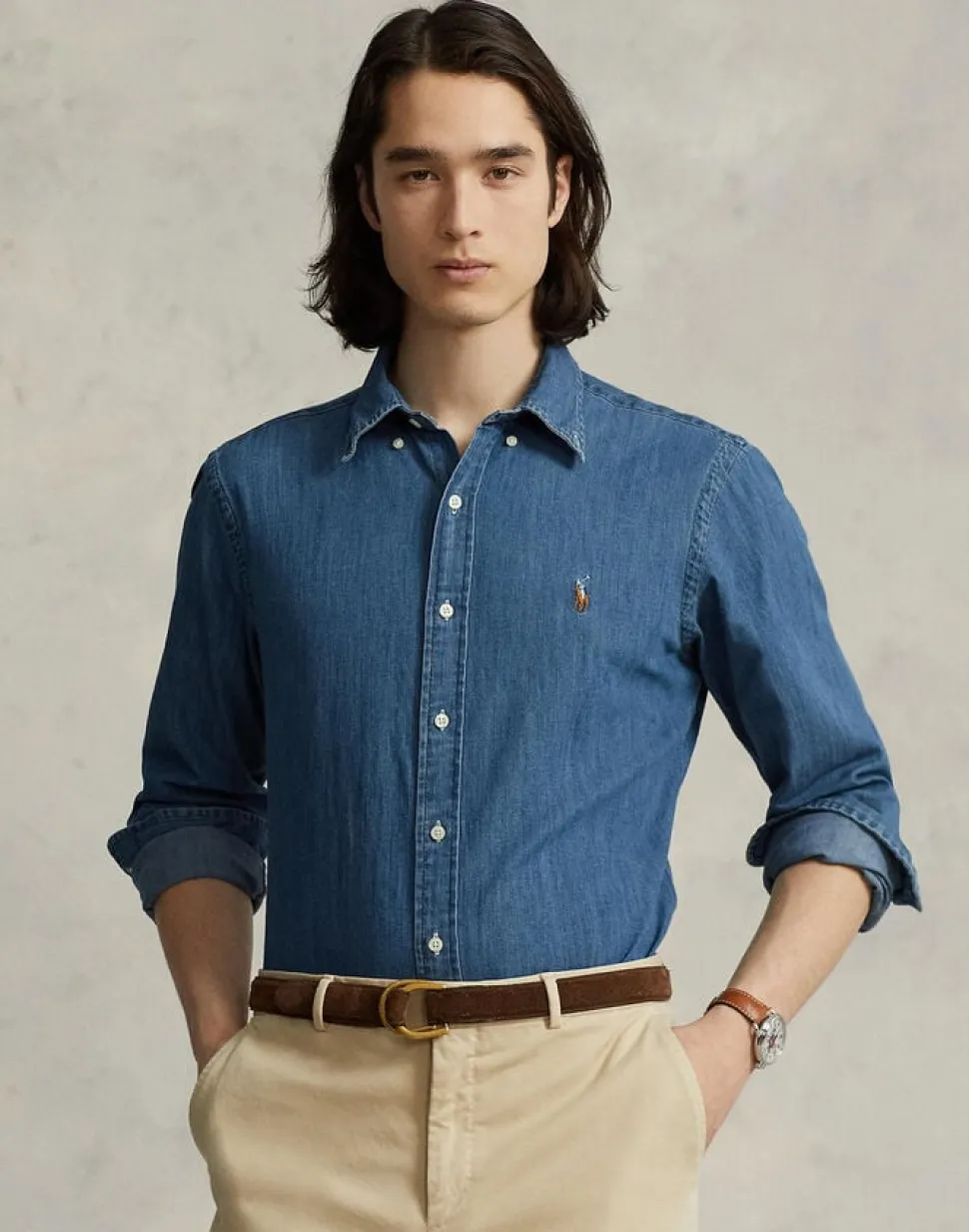 Skjorte fra Polo Ralph Lauren i en blød denimkvalitet af 100% bomuld. Skjorten er ‘Custom Fit’ i modellen med knaplukning på fronten, ‘button-down’-krave, lange ærmer med manchetter samt mærkets logo syet på brystet.