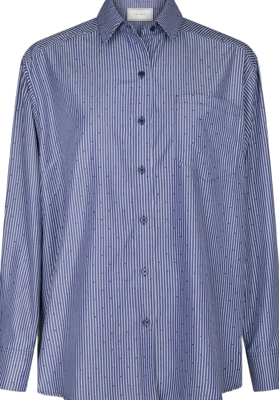 Oversize skjorte i poplin med dekorative sten. Skjorten har en klassisk krave, lange ærmer med sænkede skuldre, en brystlomme og knaplukning langs fronten. Den er lavet i en bomuldsblanding. Modellen er iført størrelse 36.