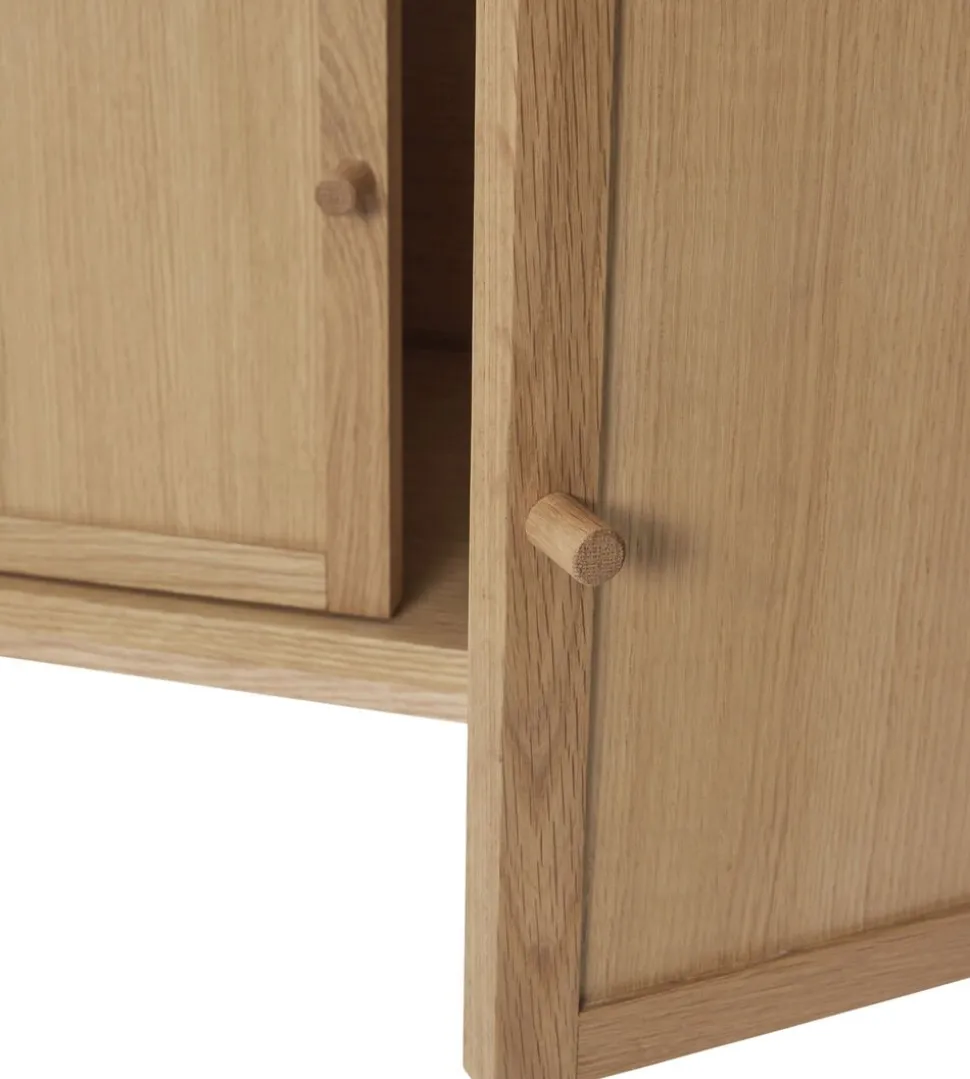 Fritstående konsolbord med to låger skabt af egetræ og egetræsfiner.