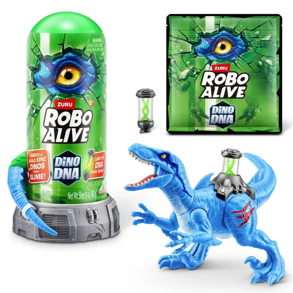 Opdag fortidens hemmeligheder med den Robo Alive Dino DNA lysende Helix-rygrad. Pak ud og søg den dryppende slim igennem for at finde dinodele og bygge enestående dinoer 3 dinosaurer til at bygge og samle på. Opdag din indre palæontolog.