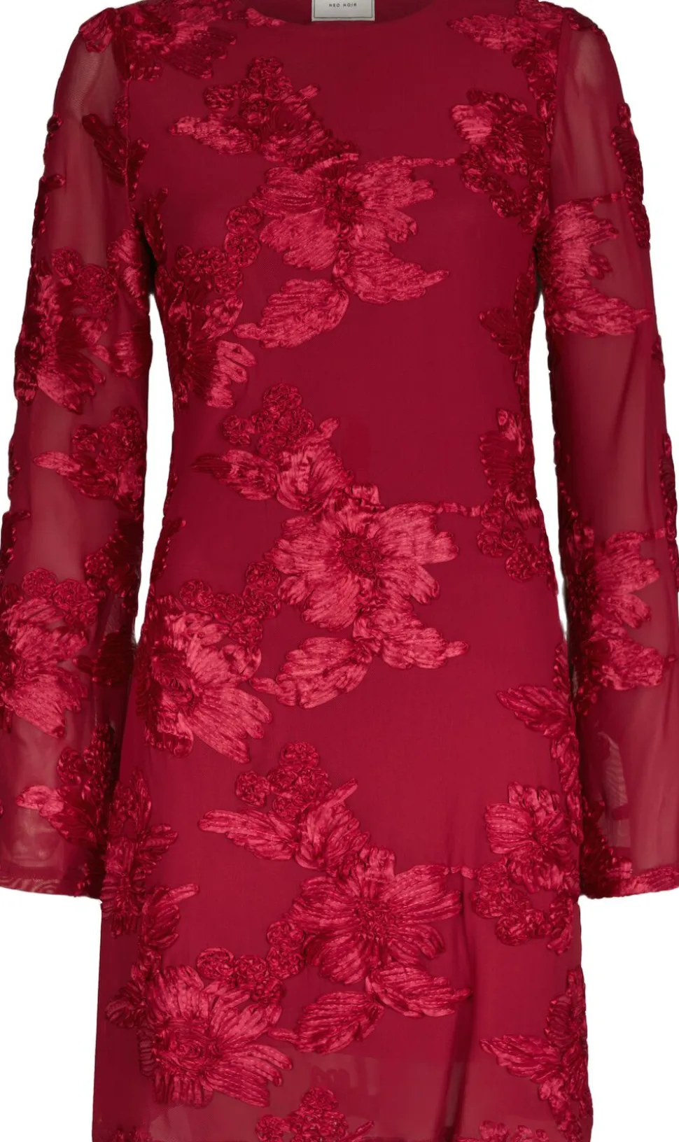 Sød kort A-formet kjole med lange vig ærmer, in en fin blomster mesh kvalitet. Modellen er 176 cm høj og er iført en str. 36.