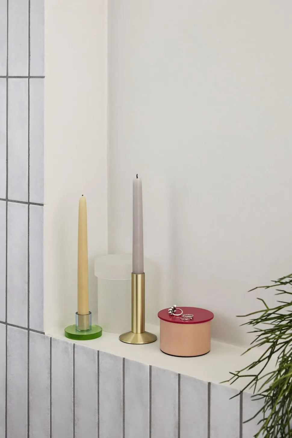 Rød og lyserød lille opbevaringsbeholder fremstillet af Pudder metal.