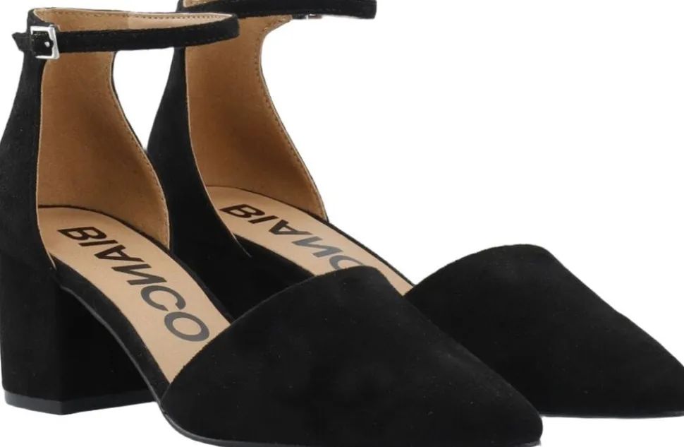 Skøn sko fra Bianco i en lækker kvalitet med ruskindslook. Skoen er enkel i modellen med en spids snude, en hæl på 6cm samt en smal ankelrem, der lukkes på skoens yderside med et lille spænde. En klassisk og elegant sko.