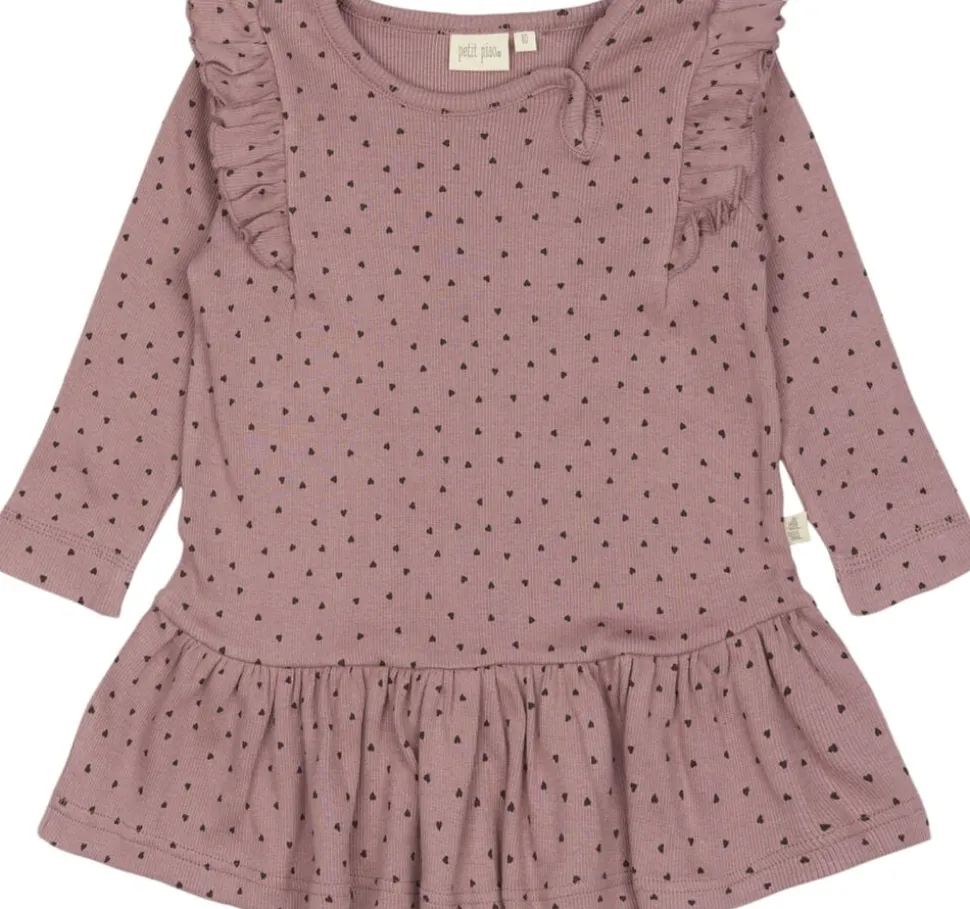 Langærmet kjole i vores klassiske rib kvalitet med fine små hjerter. I venstre side af halsåbningen har vi vores signaturåbning med trykknap for nemt tøjskift. Kjolen har en lav overskæring med rynk i bunden for at give det feminint udtryk og en sød flæse ved skulderen. Materialet er blødt og meget strækbart, designet til komfort og leg. Produceret i Indien.
