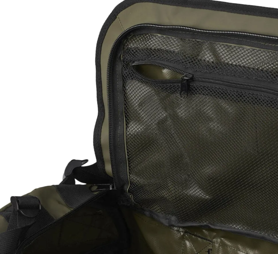 Tasken har håndtag i siderne og har remme så man kan tage tasken på ryggen. Remmene er syet fast med en kraftig tråd så den kan holde til mere. Den vandtætte top/låg dækker over lynlåsen og hplder vandet ude. Tasken kommer i 3 farver, gul, army grøn og sort. Og kommer i 3 forskellige størrelser Small er på 45Liter, Medium er 65 Liter og Large er på 85 Liter.