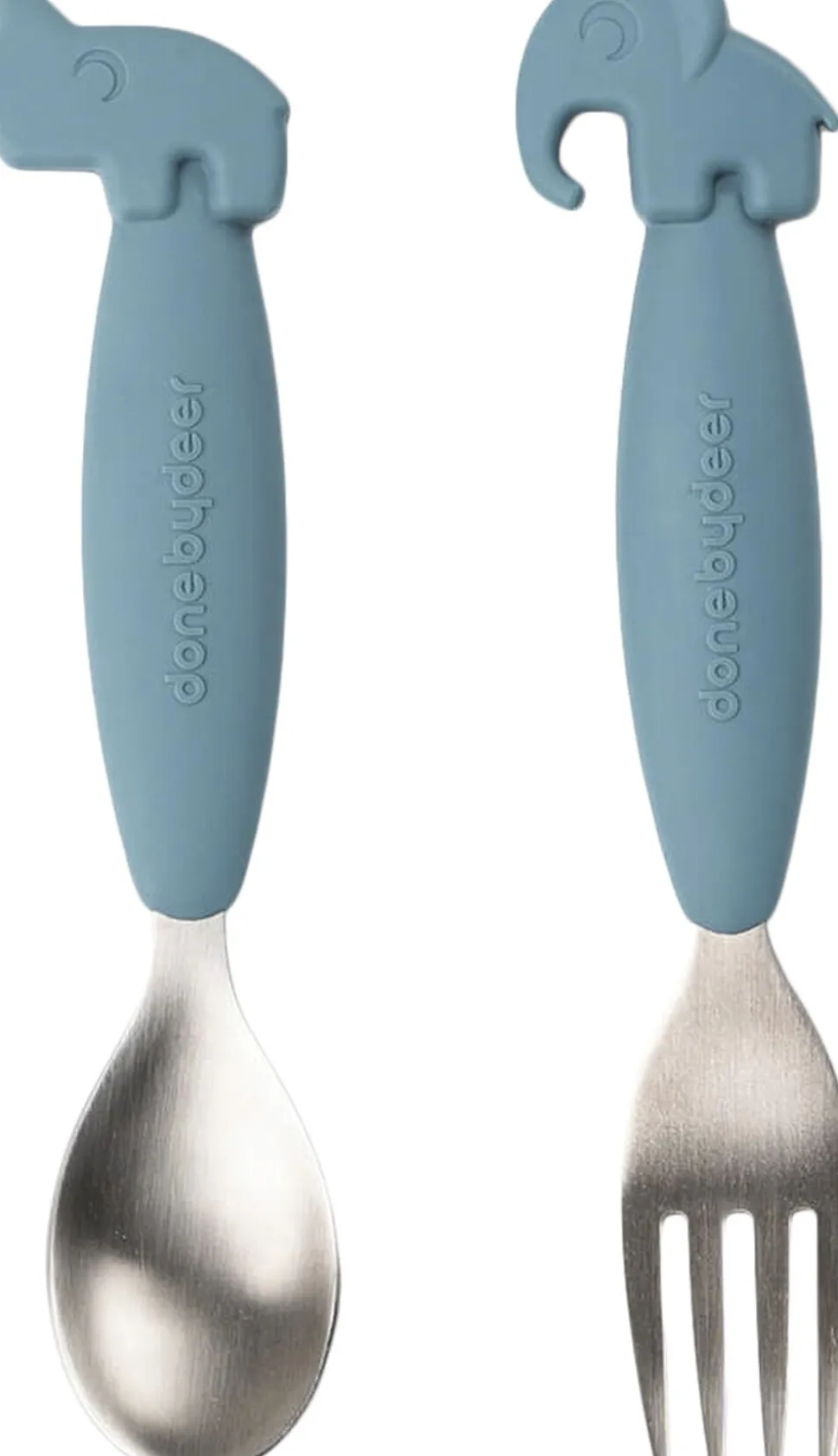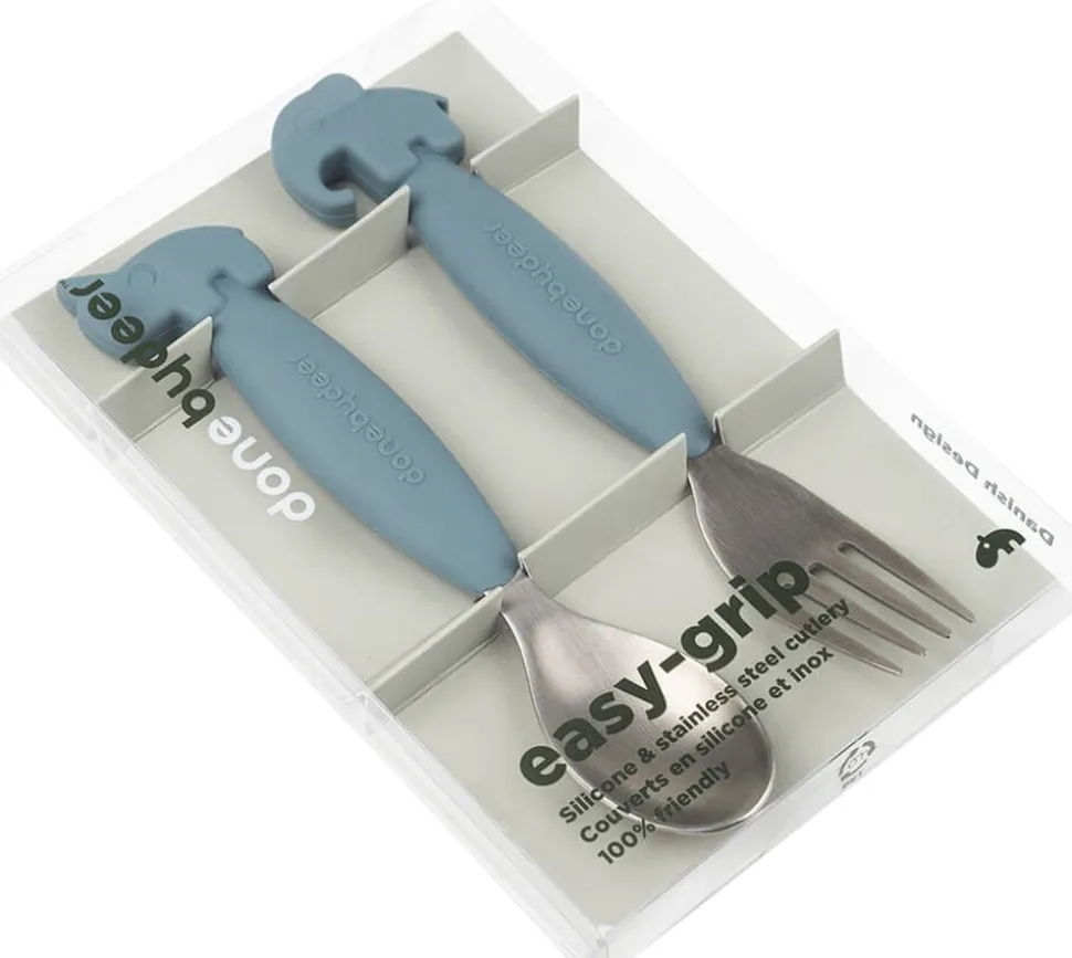 Deer friends bestiksættet med easy grip består af en ske og en gaffel. Easy grip giver et fast greb og hjælper dit barn, så det bliver nemmere at bruge bestik. Det er afgørende at have et godt børnebestik, hvis det skal være sjovt at spise selv. Det søde bestik har bløde anti-slip silikone håndtag, som helt sikkert vil gøre det til et favoritsæt. Størrelsen på børnebestikket er perfekt for en selvstændig tumling, der er ved at lære at spise med bestik. Den blå Elphee gaffel og Nozo ske matcher resten af Done by Deers servicekollektion.