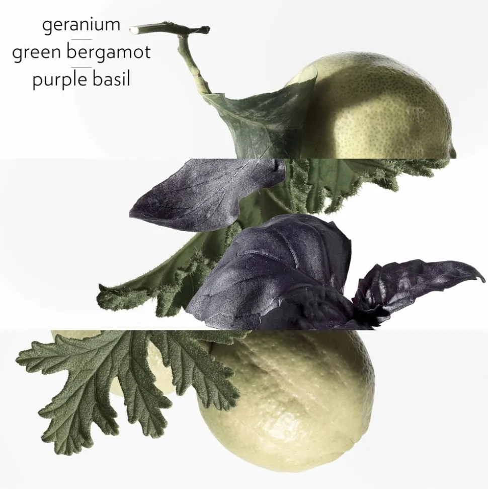 Eau de basilic pourpre er en dyb og generøs purpurrød basilikum med en aromatisk friskhed, der forstærkes af energien fra let og ren grøn geranium og af geranium, som giver den karakter.