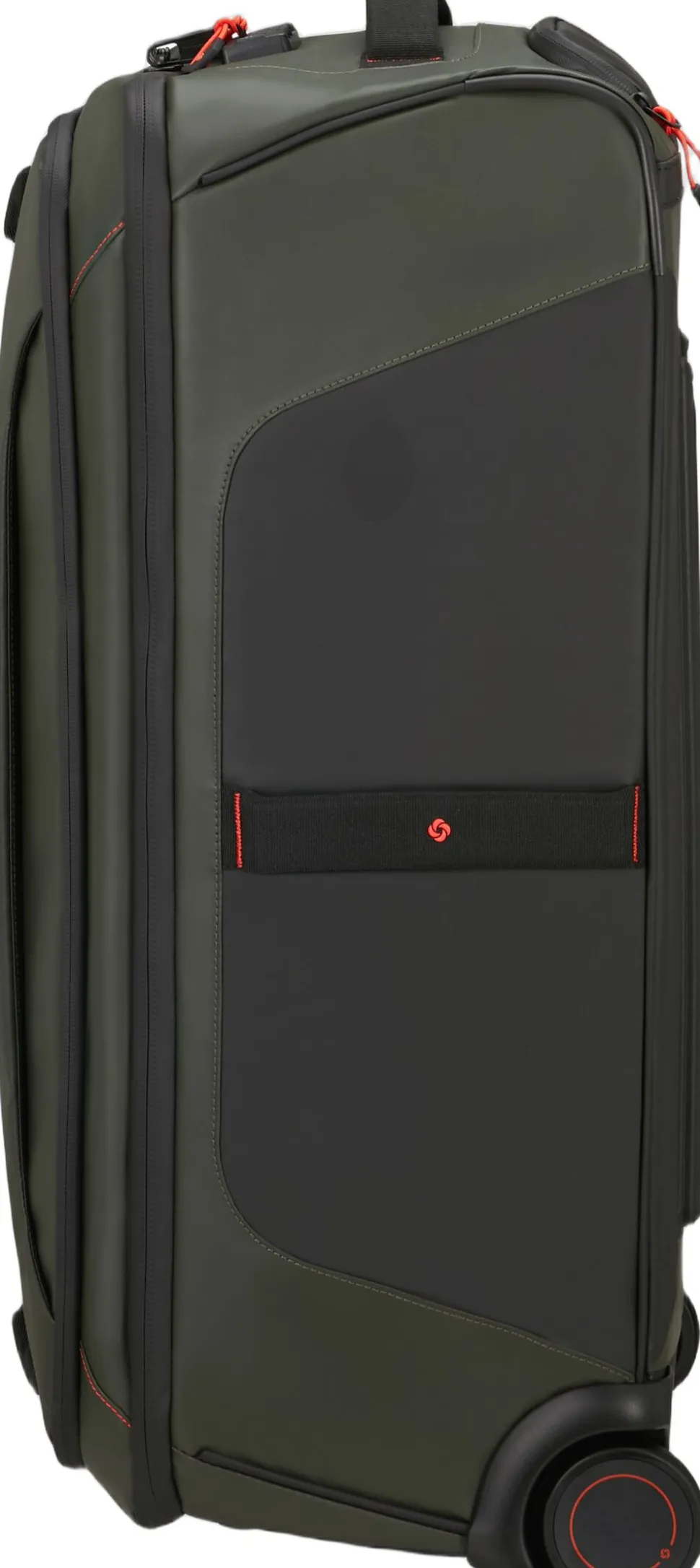 Duffle på hjul hvor både det udvendige og indvendige stof er lavet af genbrugt nylon og polyester, vandafvisende materiale, front og sidelomme, TSA lås, rumindhold 76 liter, vægt 2,9 kg. 5 års begrænset garanti.