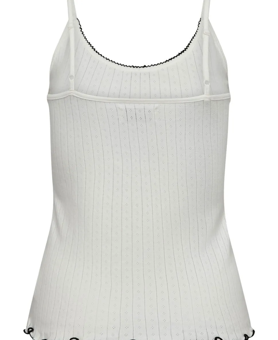 Top fra Magasin du Nord Collection i den blødeste kvalitet af 100% økologisk bomuld med GOTS-certificering. Toppen er enkel i modellen med et fint mønster, smalle skulderstropper, rib og blondekant i den runde halsudskæring samt elegante bølgekanter i bunden. En skøn top i den lækreste kvalitet.