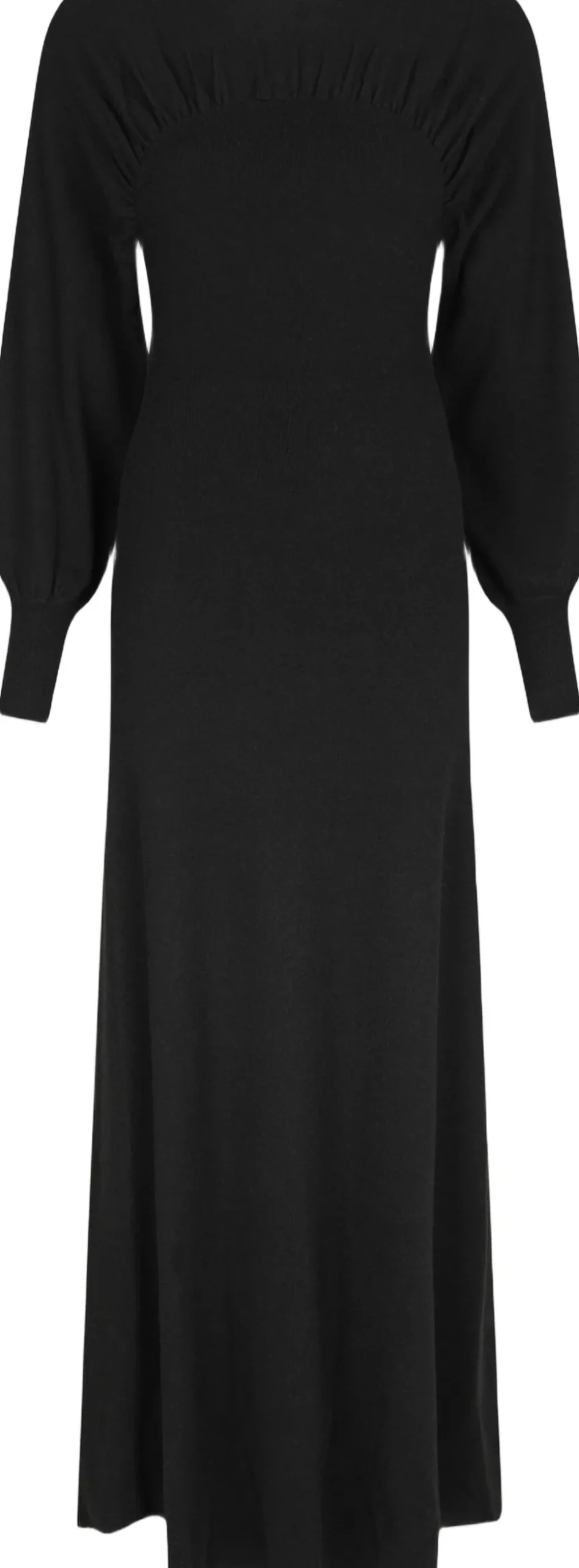 Strikket maxikjole med lange ærmer. Kjolen har bådudskæring, rynkedetaljer og tætsiddende manchetter. Den er lavet i en blød, strækbar viskoseblanding og er ribstrikket. Pasformen er almindelig. Modellen er iført størrelse 36.