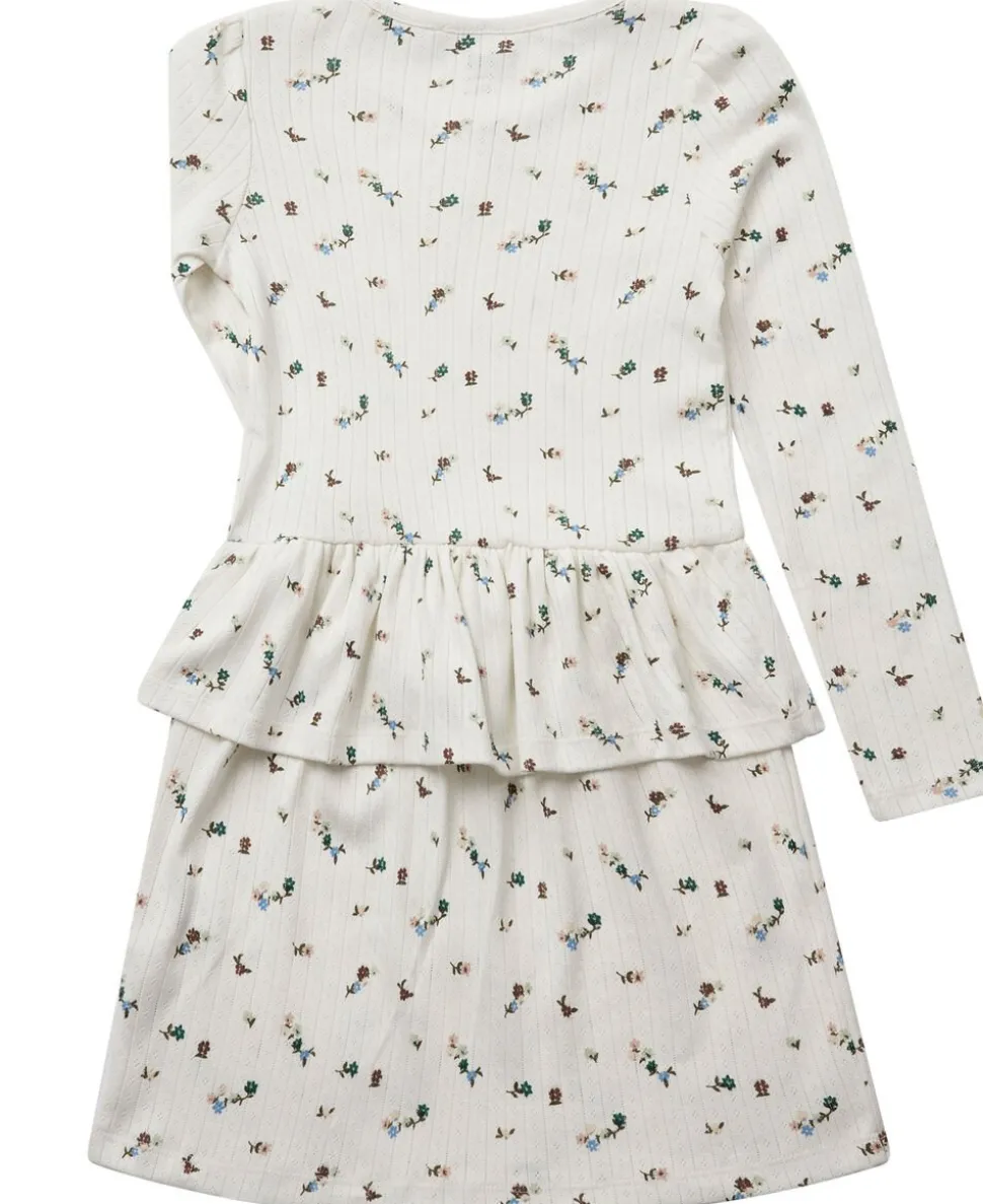 Kjole fra Magasin du Nord Collection i den blødeste kvalitet af 100% økologisk bomuld med GOTS-certificering. Kjolen har det fineste pointellemønster, der giver materialet et let, luftigt og dekorativt udtryk. Derudover har kjolen et blomstret print, lange ærmer, en rund halsudskæring samt en bred flæse i taljen. En skøn kjole i en lækker kvalitet.