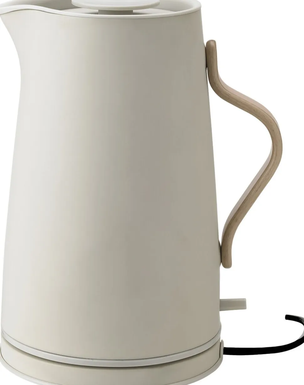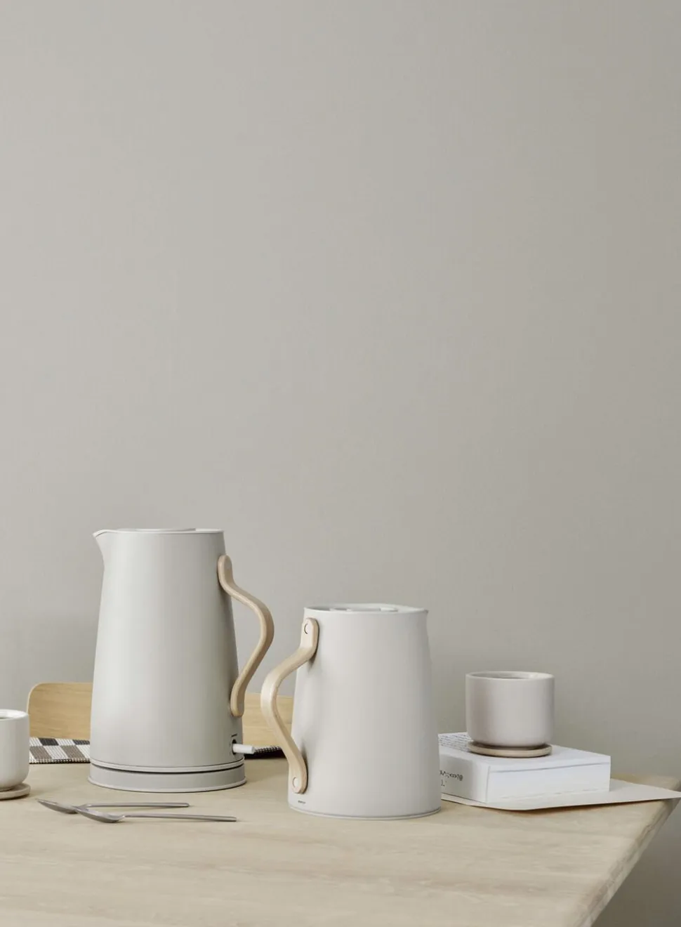 Forskøn hverdagen med Emma Steltons prisvindende te- og kaffeserie. Emma elkedlen er en æstetisk, flot stålkande med rene linjer, der i hvid matcher resten af seriens tone-i-tone nuancer. Det formspændte bøgehåndtag giver elkedlen et distinkt nordisk udtryk. Den ledningsfri elkedel kan rumme 1,2 L. og er forsynet med udtageligt kalkfilter, tørkogningssikring og automatisk slukning ved kogepunktet.