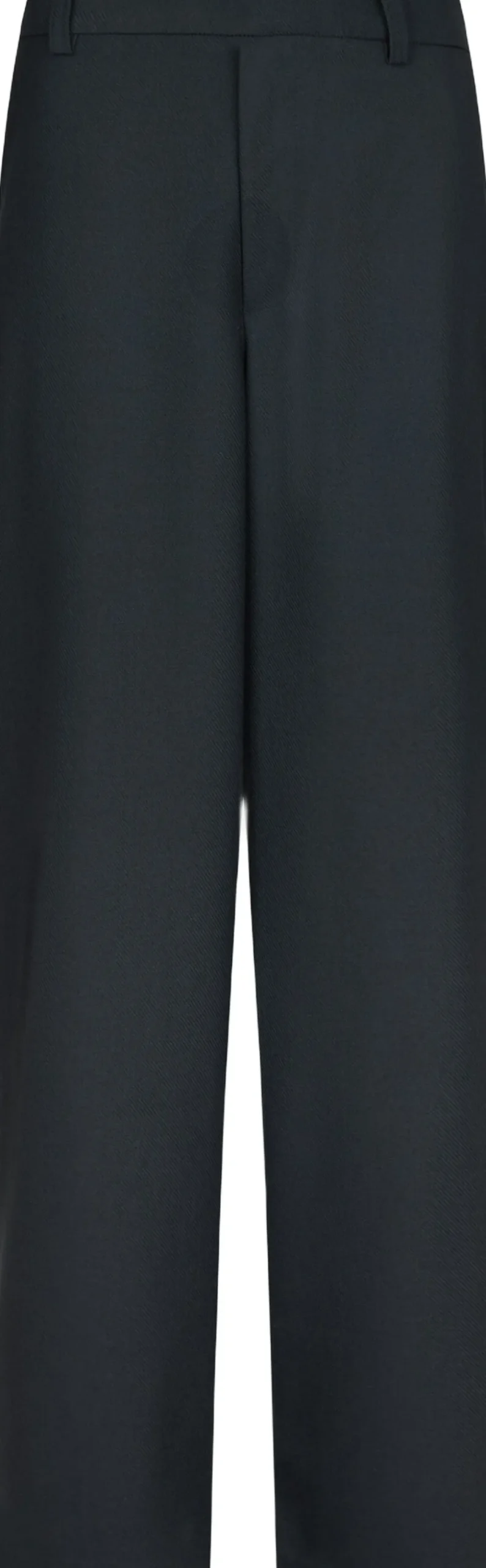 Bukser med høj talje. Bukserne har lige ben med vidde, bæltestropper i taljen og lommer i siden. De lukkes med skjult lynlås og hægte. Modellen er iført størrelse 36.