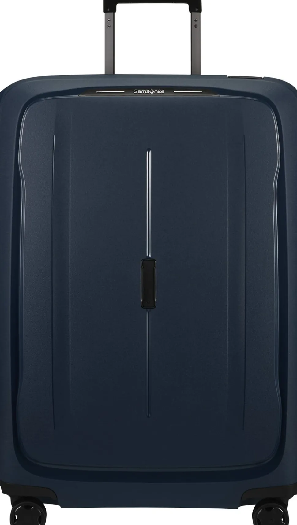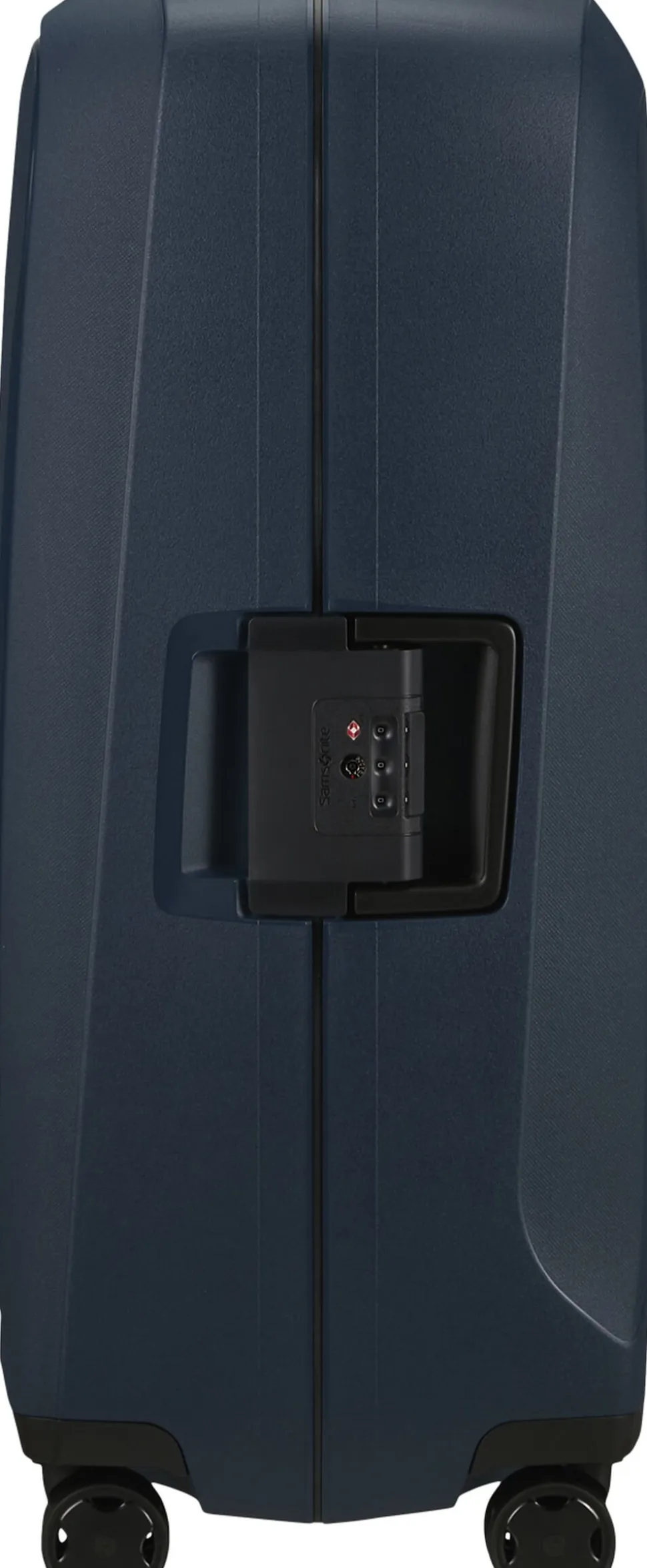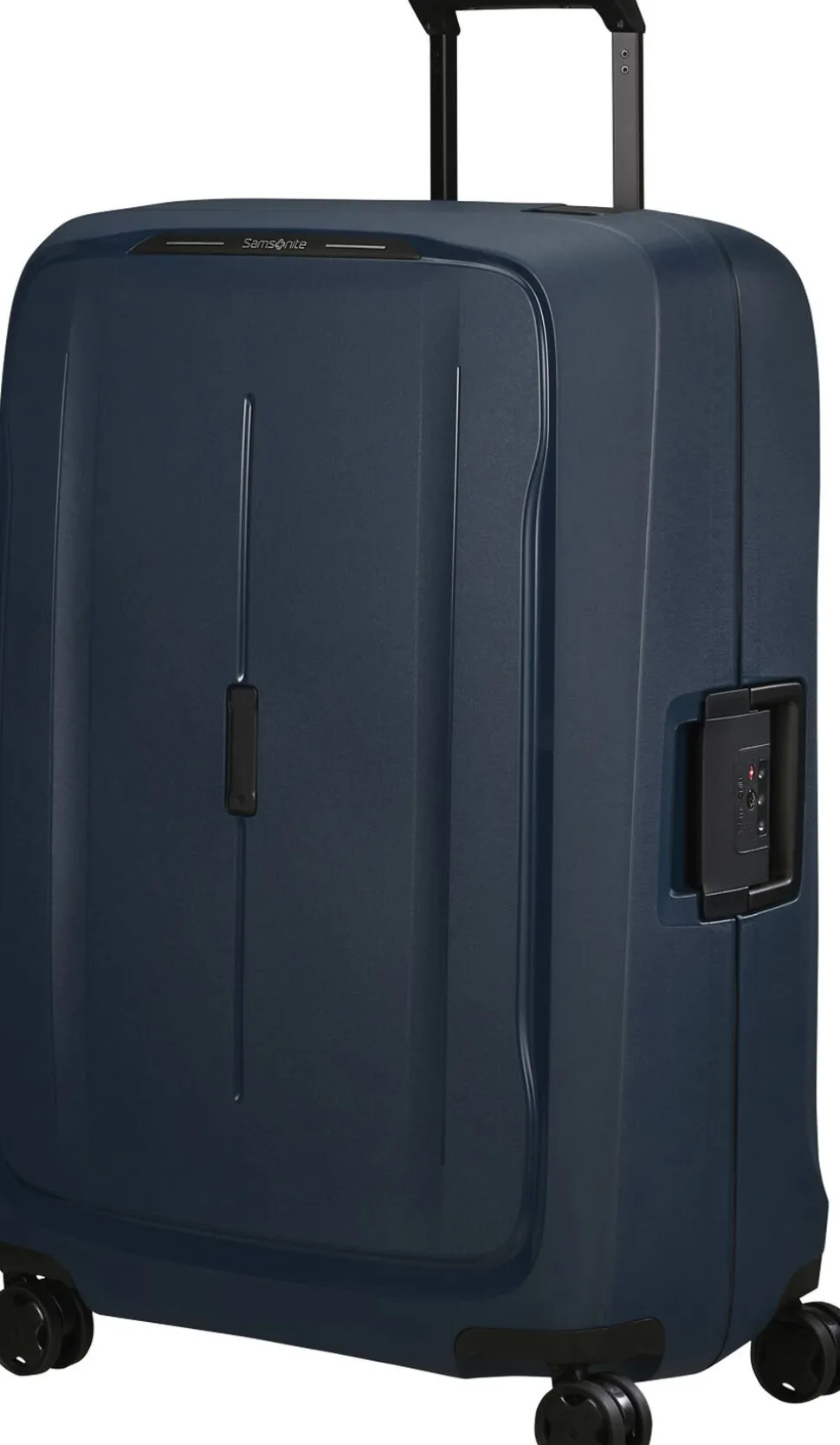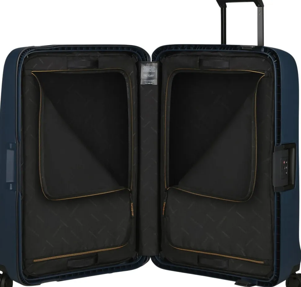 Kuffert med 4 hjul, lavet af minimum 70% genbrugt polypropylen, stoffet indvendigt er lavet af genbrugte pet flasker,3 punkts TSA lås, dobbelt trollystativ, 2 aftagelige pakkeposer, 4,2 kg,navneskilt,rumindhold 111 l, 5 års garanti 75x52x33 cm.