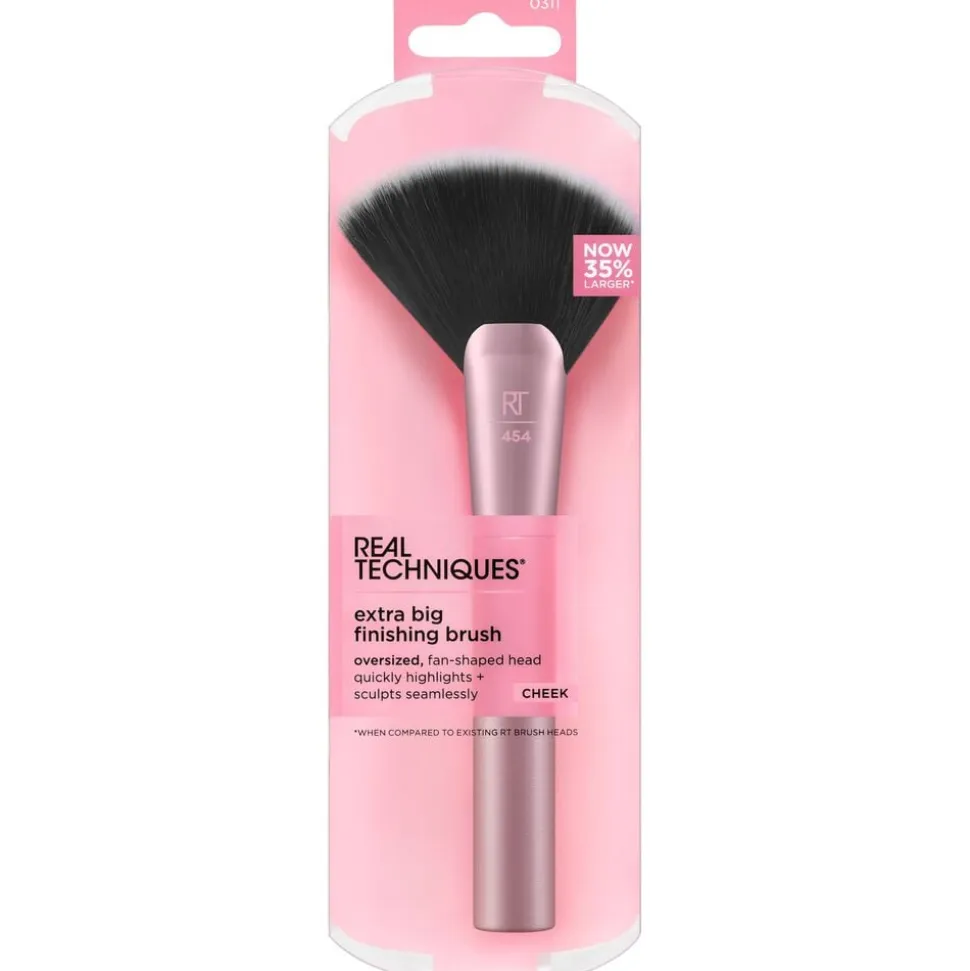 Real Techniques Extra Big Finishing Brush har et overdimensioneret, vifteformet hoved, der er 35% større end eksisterende RT-børster for hurtig påføring. 454 makeupbørste hjælper med at opnå naturligt definerede og fremhævede kindben med lethed. Den store fanbørste er bedst til brug med løse eller pressede puddercontourer, bronzere og highlighters. Påfør produktet på kindbenene, kæbelinjen og panden og blend opad for at forme og fremhæve. Som altid er denne pudderbørste lavet med UltraPlush, høj kvalitet børstehår for maksimal opsamling og påføring. For at få dine værktøjer til at holde længere anbefales det at rengøre børsterne en gang om ugen. Extra Big Finishing Brush er også 100% vegansk og cruelty-free.