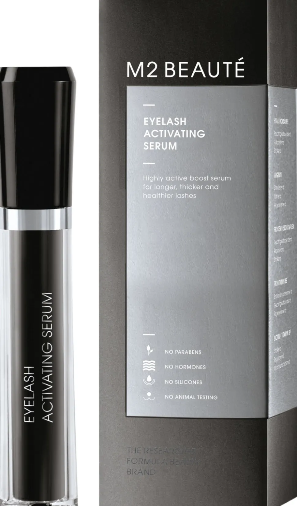 Vi garanterer, at alle M2 BEAUTÉ-produkter ikke indeholder hormoner! Den aktive ingrediens, der anvendes i EYELASH ACTIVATING SERUM, er hverken et hormon eller et hormonderivat – den kemiske struktur af den syntetisk fremstillede aktive ingrediens adskiller sig væsentligt fra den aktive ingrediens, som har oprindelse i øjenmedicin. Den kan derfor ikke interagere med celler, der har de tilsvarende receptorstrukturer – en udløsning af hormonelle reaktioner er beviseligt fuldstændig umulig. Dette er blevet bekræftet i forskellige undersøgelser fra uafhængige institutter, herunder Bund für Umwelt und Naturschutz Deutschland e.V. (BUND) eller i TOXFOX-undersøgelsen af hormonaktive stoffer i kosmetiske produkter. Yderligere information er tilgængelig her: www.bund.net/chemie/toxfox/kosmetikprodukte