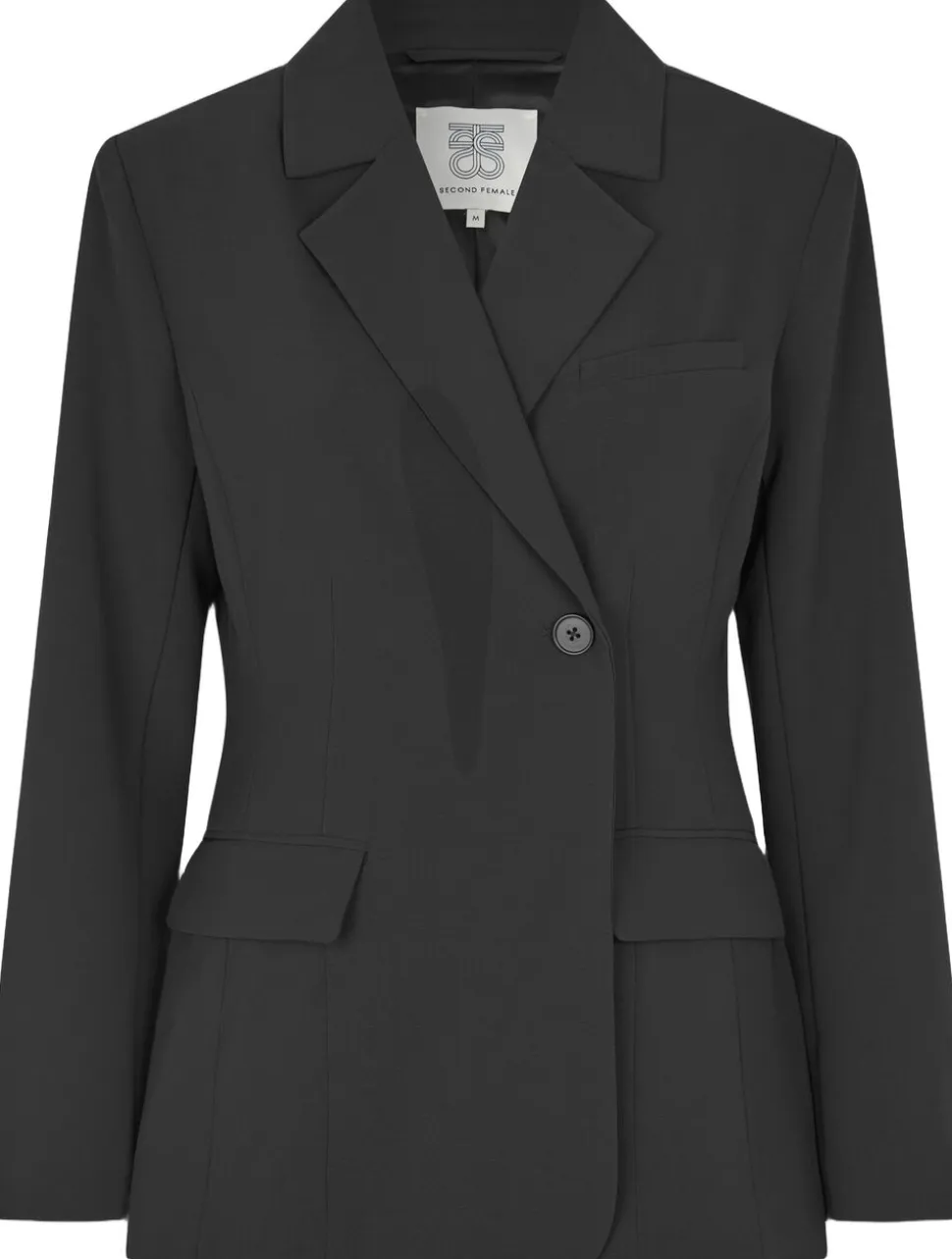 Second Female blazer. Fremstillet i et glat og draperet materiale. Med bredt hakrevers og en enkelt knap foran. Vatterede skuldre og lange ærmer med slids ved manchetterne. Helforet. Figursyede sømme,
