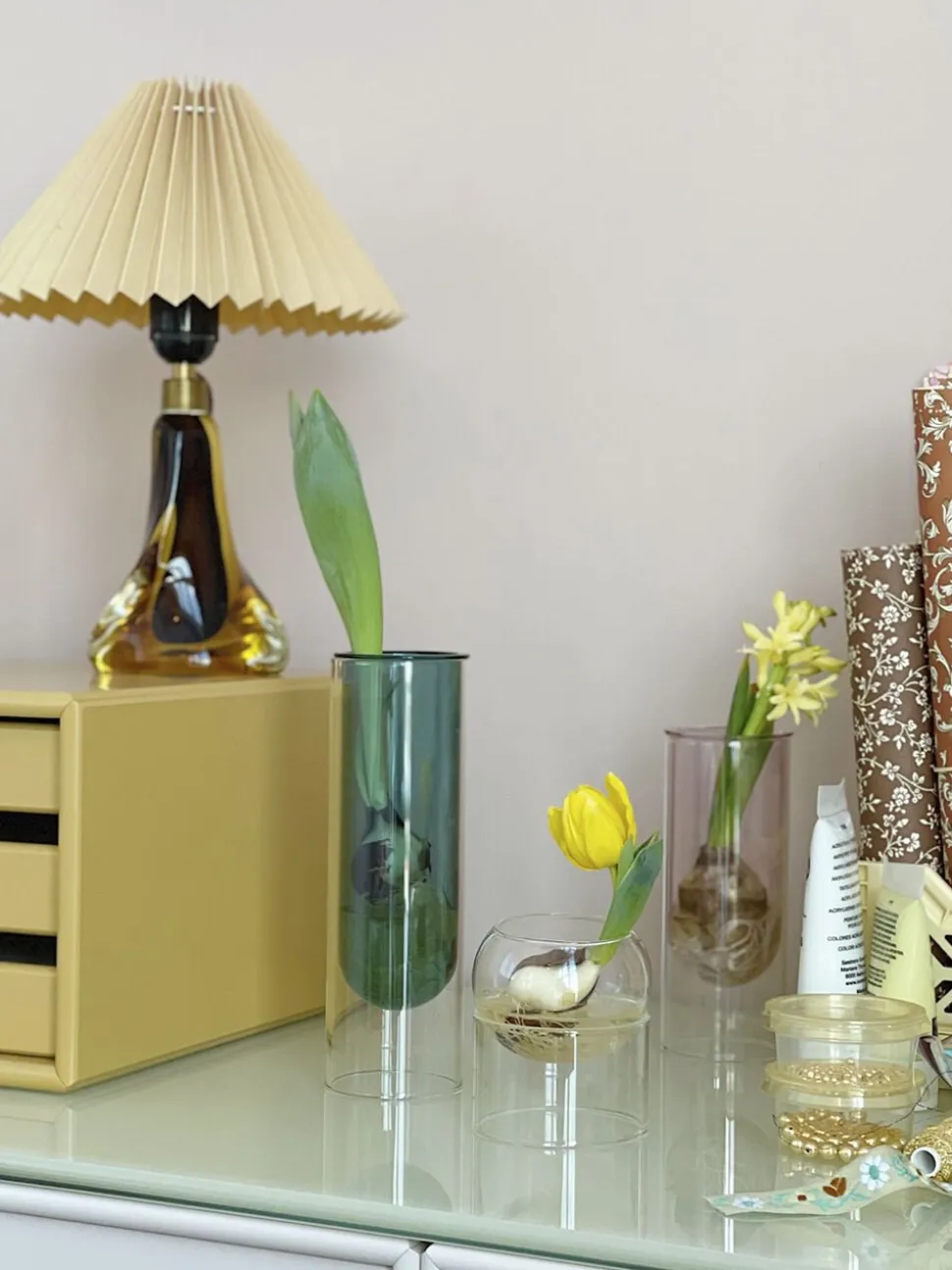 FLOWER TUBE kollektionen er en serie af cylinderformede vaser tegnet til små buketter og enkelte blomster. De er dog også smukke med forårsgrene fra haven eller stikliger, så du kan former din yndlingsplante. Vaserne fås i 2 størrelser og består af et gennemsigtigt ydre og et farvet indre, der udgør selve vasen. Denne vase er i farven cyan og mundblæst i glastypen borosilikatglas. SMUKKE FARVER TIL DIT HJEMVasen findes her i en smuk turkis farve. Det transparente ydre giver vasen et svævende og let udtryk. Farvet glas er populært i indretningen og er en nem måde at få farver trukket indedøre. Flower tube vaserne fås udover turkis også i rosa, grøn, blå og gul m.fl. og inviterer til, at man mikser dem på tværs af både farver og højde. De er også smukke enkelt ståen i fx. i en reol eller på badeværelseshylden. Brug vasen med en enkelt blomst eller to, evt. i samme nuance som vasen eller prøv dig frem med mere volumniøse blomster som eksempelvis en orkidé. Vaserne bringer elegance til et smukt dækket bord, men kan også bruges som et æstetisk pift på reolen. Vælger du tørrede blomster eller papirblomster til vasen har du både noget smukt for øjet og noget der ikke kræver pasning. Vi har i samarbejde med kunsteren Labdecor tegnet flere papirblomster i crepepair, der passer perfekt til vores vaser. DANSK DESIGN I BOROSILIKATGLASCylindervaserne er håndlavede i borosilikatglas, som er lettere og stærkere end almindeligt glas. Det kan modstå høje temperaturer og er desuden ridsefast, så du behøver altså ikke være bange for at vasen sprænger eller er sart. Kollektionen af vaser gøres nemmest rent med varmt vand og sæbe. Tilføj gerne lidt almindelig eddike til sæbeblandingen. Se også serien af boblevaser til bordet, som også kan mikses med Flower Tubes og dette mix er oplagt til et stort smukt sommerbord med blomster og lækkert mad.MÅL, VÆGT OG FARVEÅBNING: Ø65 mmHØJDE: H200 mmVÆGT: inkl. emballage 0,460 kgFARVE: CyanStudio About er et dansk designstudio. Alle objekter er designet af arkitekt Mikkel Lang Mikkelsen
