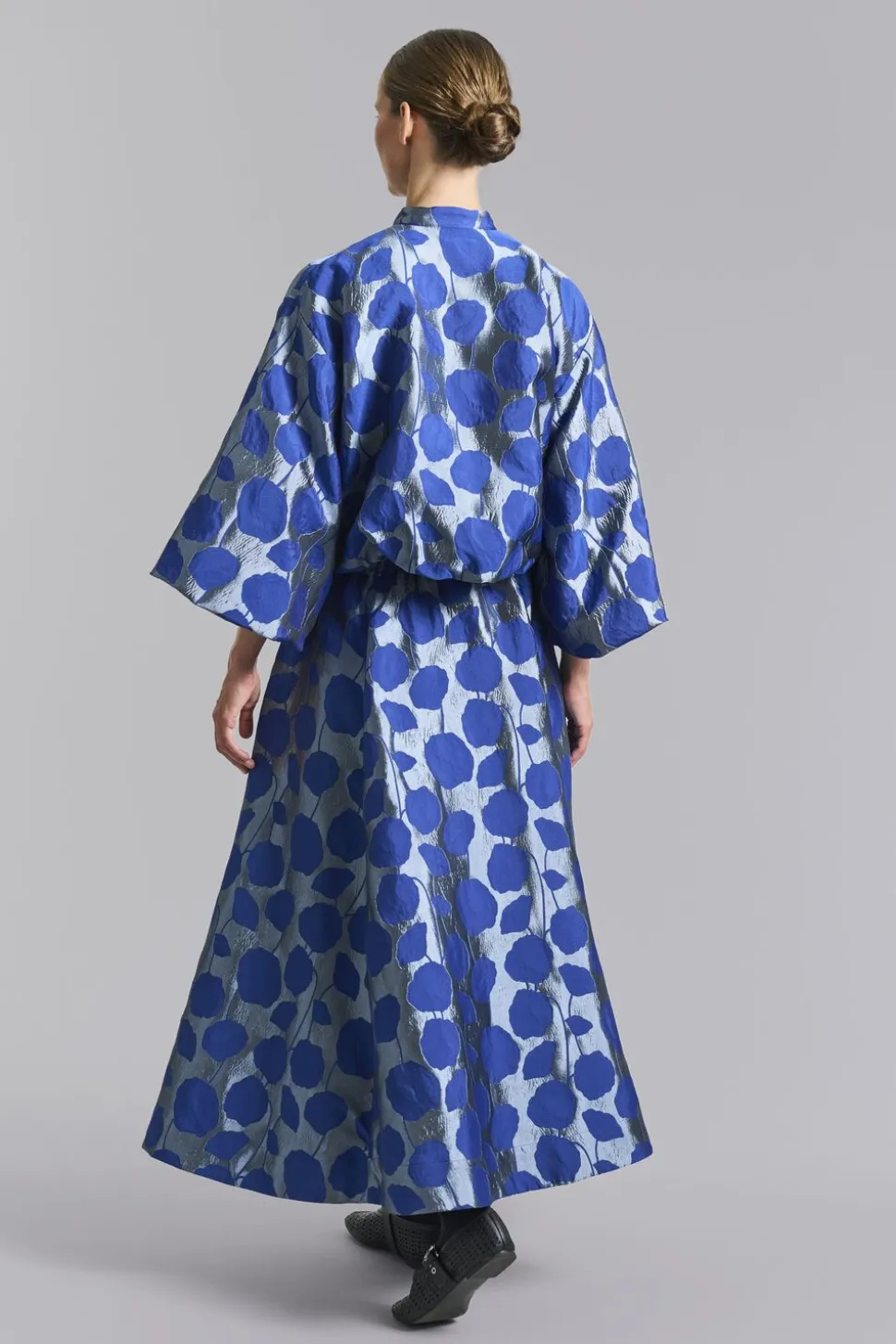 Nederdel i det smukkeste, shiny jacquard stof forsynet med grafiske blomsterranker. Stoffet er relativt kraftigt og giver en fantastisk volumen til nederdelen. En nederdel, der vil gøre hverdagen festlig og festen ekstra elegant.