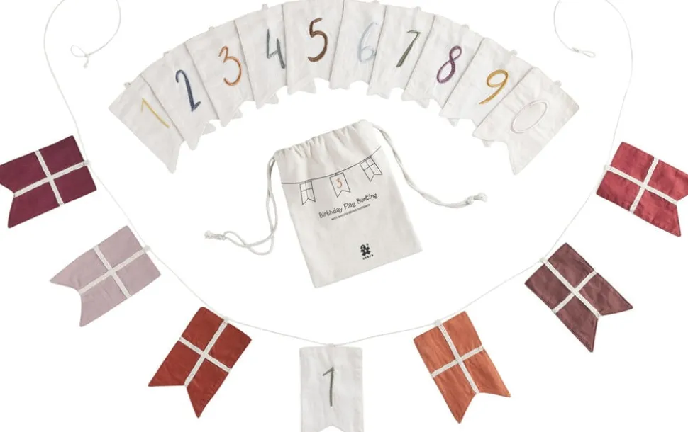 Fødselsdage er noget særligt, og den søde flagranke er perfekt til at fejre alle fødselarer i familien. Flagranken består af 6 dannebrogsflag fremstillet af økologisk bomuld i afstemte røde nuancer samt 11 flag med tallene fra 0 til 9 broderet på. Der er et ekstra 1-tal i den medfølgende opbevaringspose, så 11-års fødselsdagen også kan fejres.
