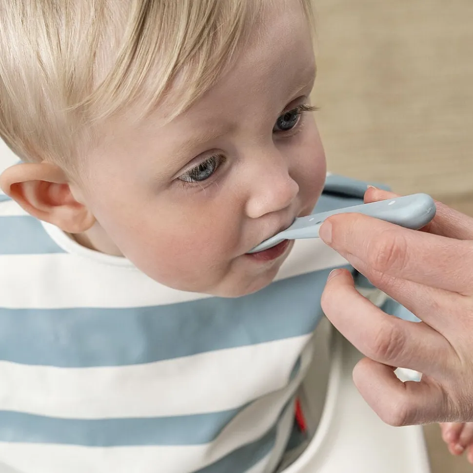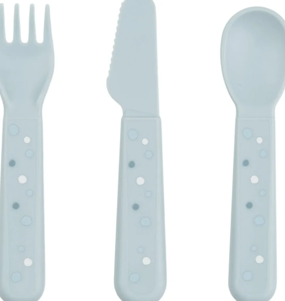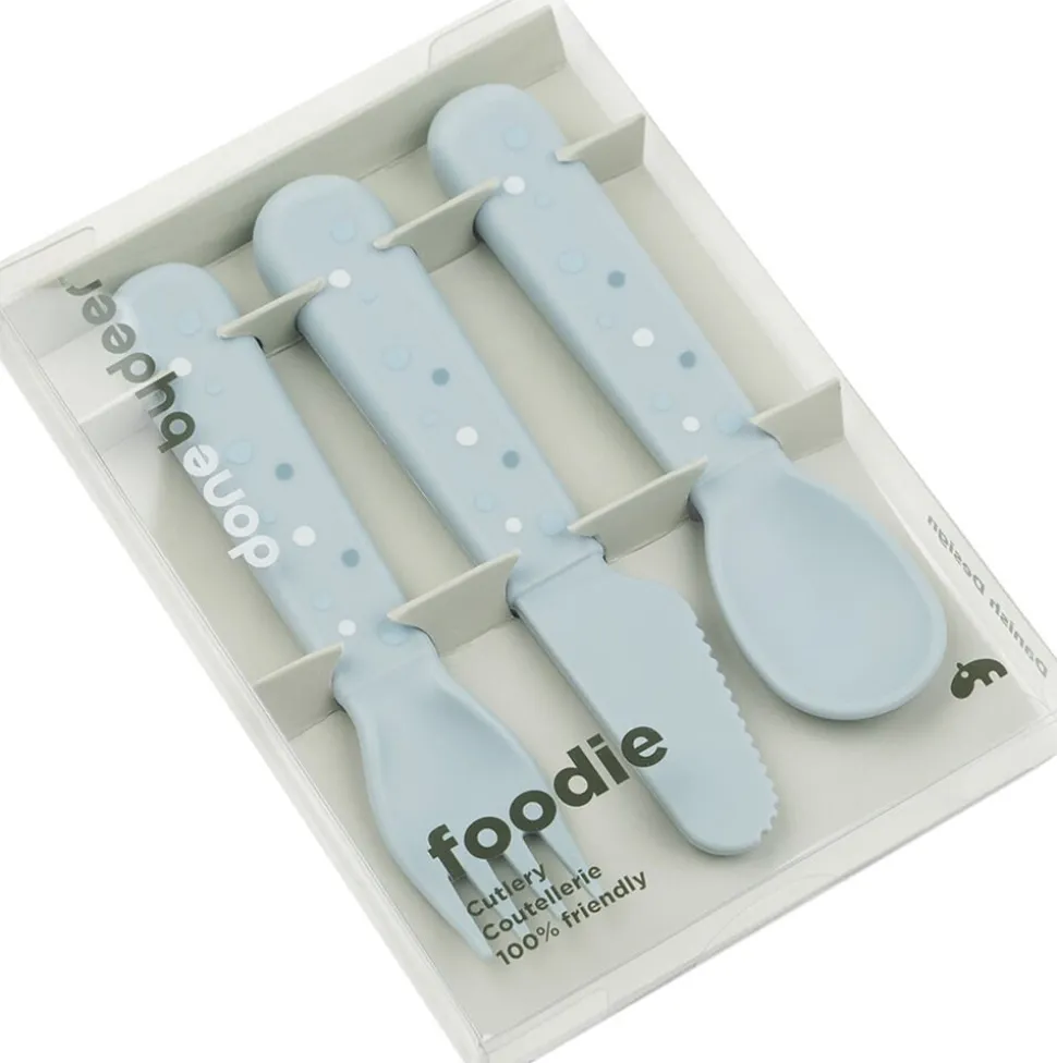 Foodie bestiksættet med Happy dots har afrundede kanter, som gør det sikkert og behageligt for dit barn at øve sig i at spise med bestik. Børnebestiksættet passer perfekt til små hænder og er gennemtestet af børn. Det søde bestiksæt til babyer og tumlinger består af en ske, en gaffel en og kniv. Efter utallige familiemiddage og børnefester kan bestikket affaldssorteres som plast og genanvendes til fremstilling af nye hverdagsprodukter. Det fine, blå bestiksæt er pyntet med legende Happy dots, som gør ethvert måltid til en fest. Bestikket har en mat, silkeblød overflade og matcher resten af Foodie kollektionen.