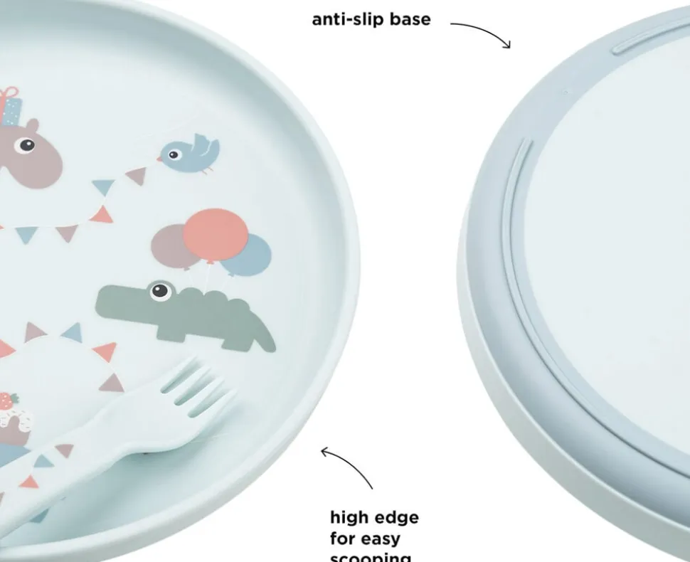 - Materiale:Tallerken: 100% fødevarekvalitet PP med antislip TPE. Bestik: 100% fød