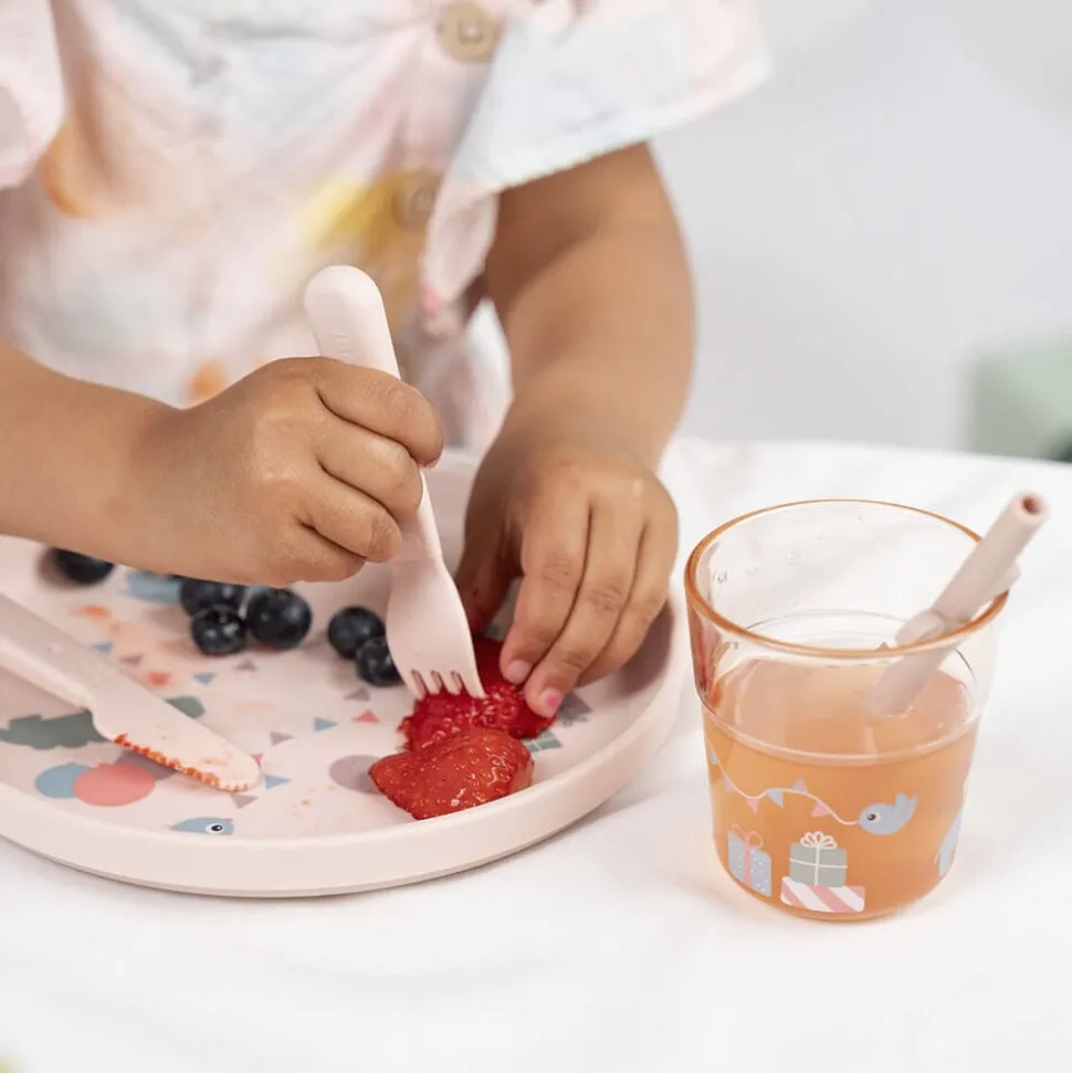 - Materiale:Tallerken: 100% fødevarekvalitet PP med antislip TPE. Bestik: 100% fød