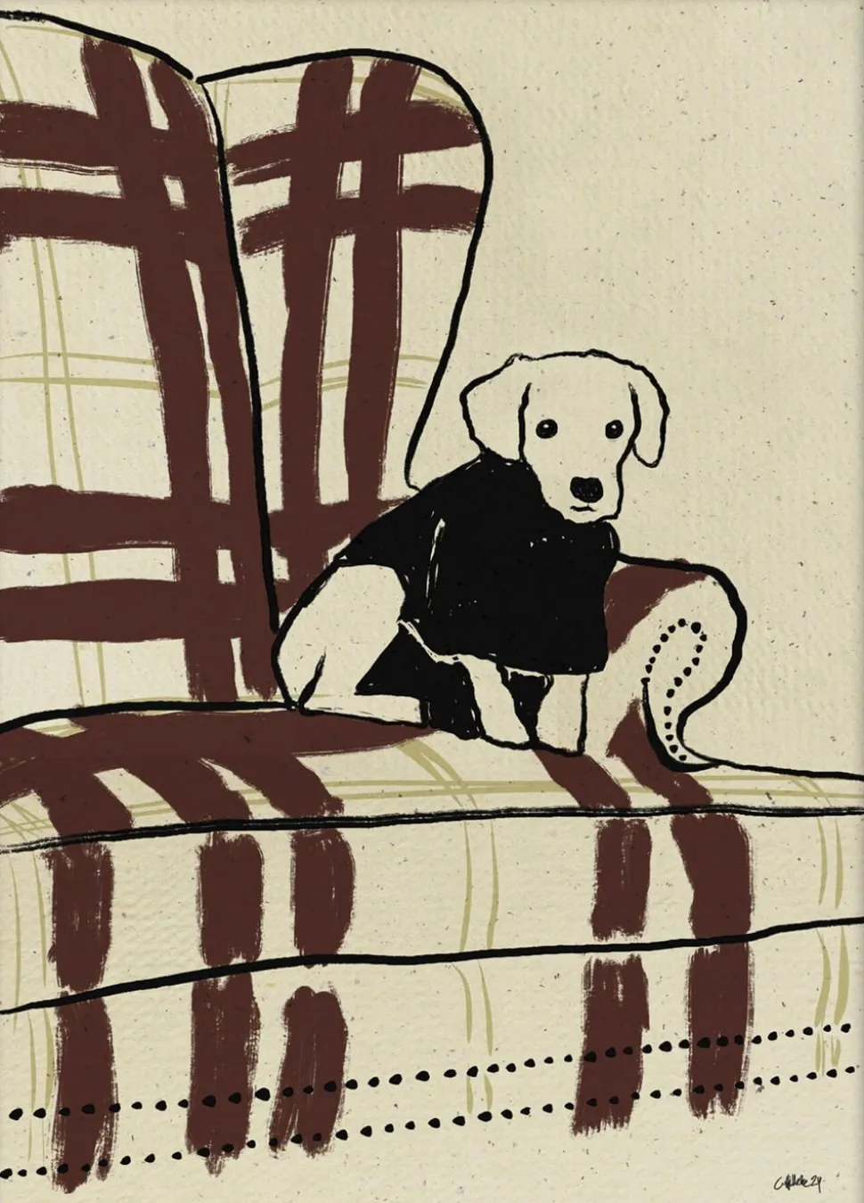Charmerende kunstplakat med en sød hund i en klassisk stol, der bringer hygge og personlighed til din væg. Perfekt til hundeelskere