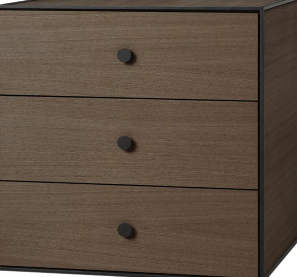 Frame 49 med 3 skuffer er en fleksibel opbevaringsløsning bestående af et kvadratisk modul i en kubistisk ramme. Det enkle opbevaringssystem er inspireret af Mogens Lassens Kubus lysestage fra 1962, som bygger på strenge matematiske formler og stor præcision. Hans mantra var at det hele skal hænge sammen. På den måde skabes der ro og harmoni for øjet. Frame findes i mange varianter, og kan sættes i utallige kontekster. Framemodulerne kan hænges direkte på væggen eller stå frit på gulvet. Kombiner Frame til en klassisk reol, et natbord, en rumdeler eller noget helt fjerde. Mulighederne for individuelle kombinationer er uendelige. Framemodulerne er tilgængelige med eller uden låger, hylder eller skuffer, så du kan finde den opbevaringsløsning, der matcher dit behov for organisering og opbevaring. Denne Frame variant indeholder en Frame 49 med 3 skuffer, som har et soft close udtrækningssystem og skjulte skinner.Hele Framekollektionen bliver produceret og samlet i hånden i Danmark og er skabt med sans for detaljerne. Ligesom kollektionen forener funktion, kvalitet og æstetik.
