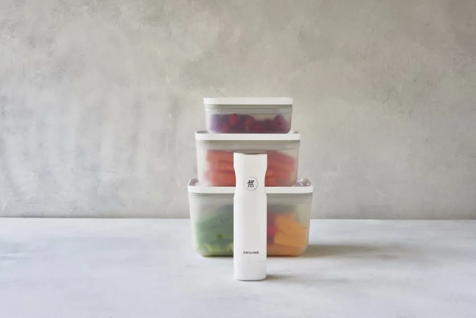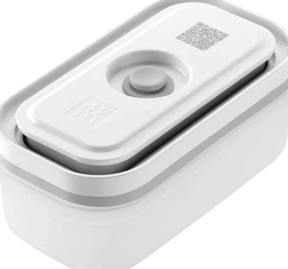 ZWILLING FRESH & SAVE er et vakuumopbevaringssystem, der holder maden frisk op til 5x længere. Opbevaringssystemet bibeholder vigtige næringsstoffer og vitaminer i den opbevarede mad. Nu har du muligheden for at komme i gang med at foodpreppe, minimere madspild, og i det hele taget at optimere måden at gemme råvarer på. Varmebestandig op til 97 °C. Fryseegnet indtil -20 °C. Låg og beholder kan gå i mikroovnen samt opvaskemaskinen. Let og brudsikker. Materialer: BPA fri plast (beholder og låg), silikone (ventil, tætning). Vakuumlåg med innovativ dobbelt forseglingsteknologi. Enkel registrering med den gratis app der vha. QR koden holder styr på holdbarhed og indhold. Forhindrer frostskader på madvarer. Holder maden friskere i op til 5 gange længere sammenlignet med andre opbevaringsmetoder uden brug af vakuum.Vakuumopbevaring bibeholder vigtige vitaminer samt næringsstoffer i den opbevarede mad. Beholdere i S, M, L kan nemt stables sammen.