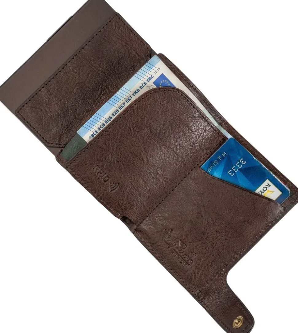 Furbo kortholder – et stilfuldt alternativ til den klassiske pung. Fremstillet i vegetabilsk garvet italiensk koskind med aluminiumskortholder og popup-system til 4–6 kort. Med plads til sedler, kvitteringer, ekstra kort samt udvendigt møntrum. Beskytter mod skader, snavs og RFID-datatyveri.