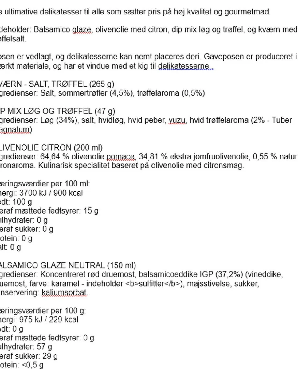 De ultimative delikatesser til alle som sætter pris på høj kvalitet og gourmetmad. Indeholder: Balsamicocrème, økologisk eksta jomfru olivenolie med citron, trøffelmayonnaise, og saltkværn med trøffelsalt samt et inspirationskort med en opskrift, hvor delikatesserne anvendes. Posen er vedlagt og delikatesserne kan nemt pakkes deri. Gaveposen er produceret i et stærkt materiale og har et vindue med et kig til delikatesserne.