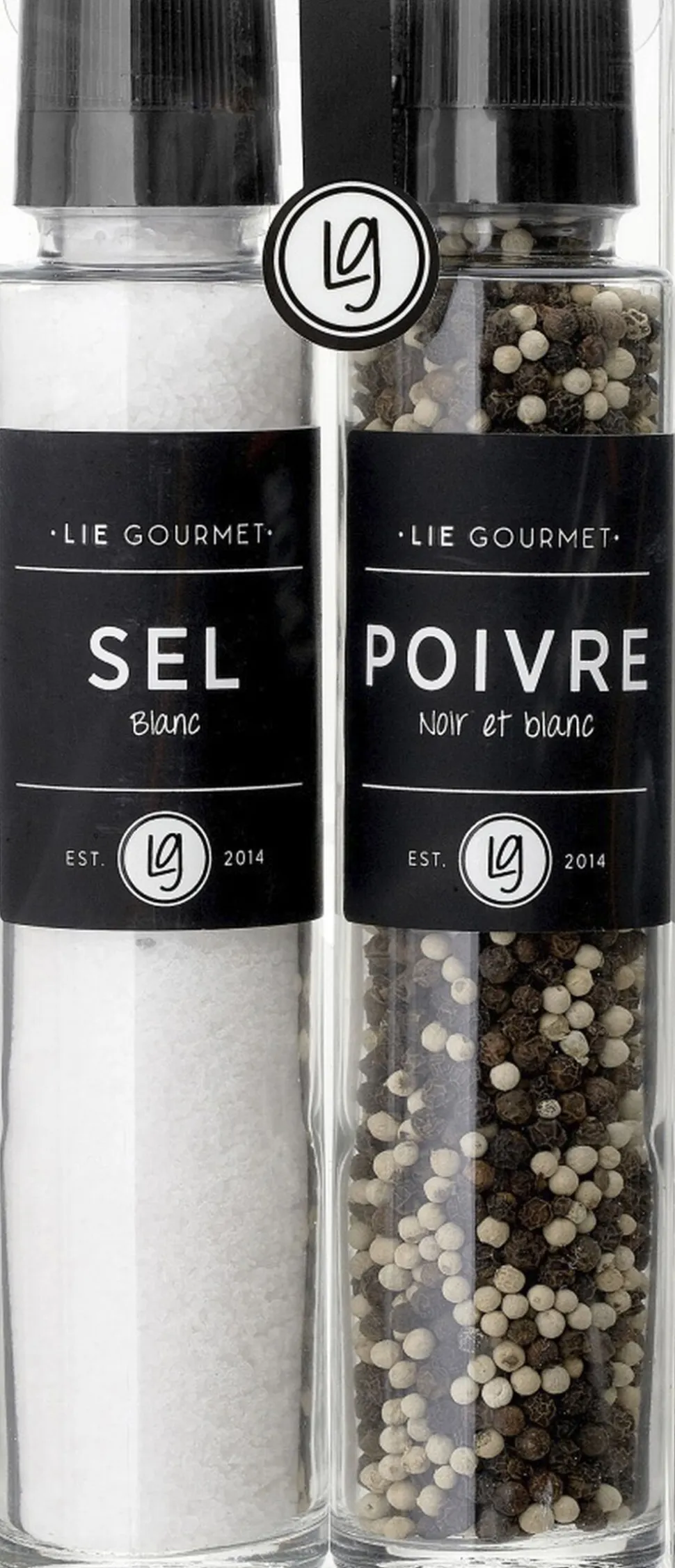 Smukt gavesæt med kværne med havsalt og sort/hvid peberblanding. En oplagt gaveidé som alle kan bruge til madlavning i hverdagen. Kværnene er af glas og pakket i en fin transperant æske og lukket med et LIE GOURMET-klistermærke.