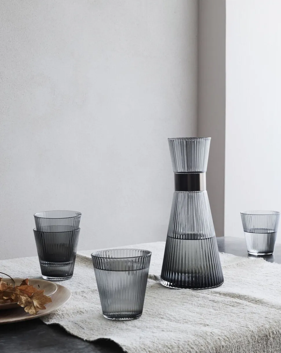 • Elegance i hver detalje: Vandkaraffelen er skabt i røgfarvet, mundblæst glas, der giver den et let og elegant udtryk. Den gentagne riller på overfladen skaber et raffineret optisk spil, når lyset brydes.