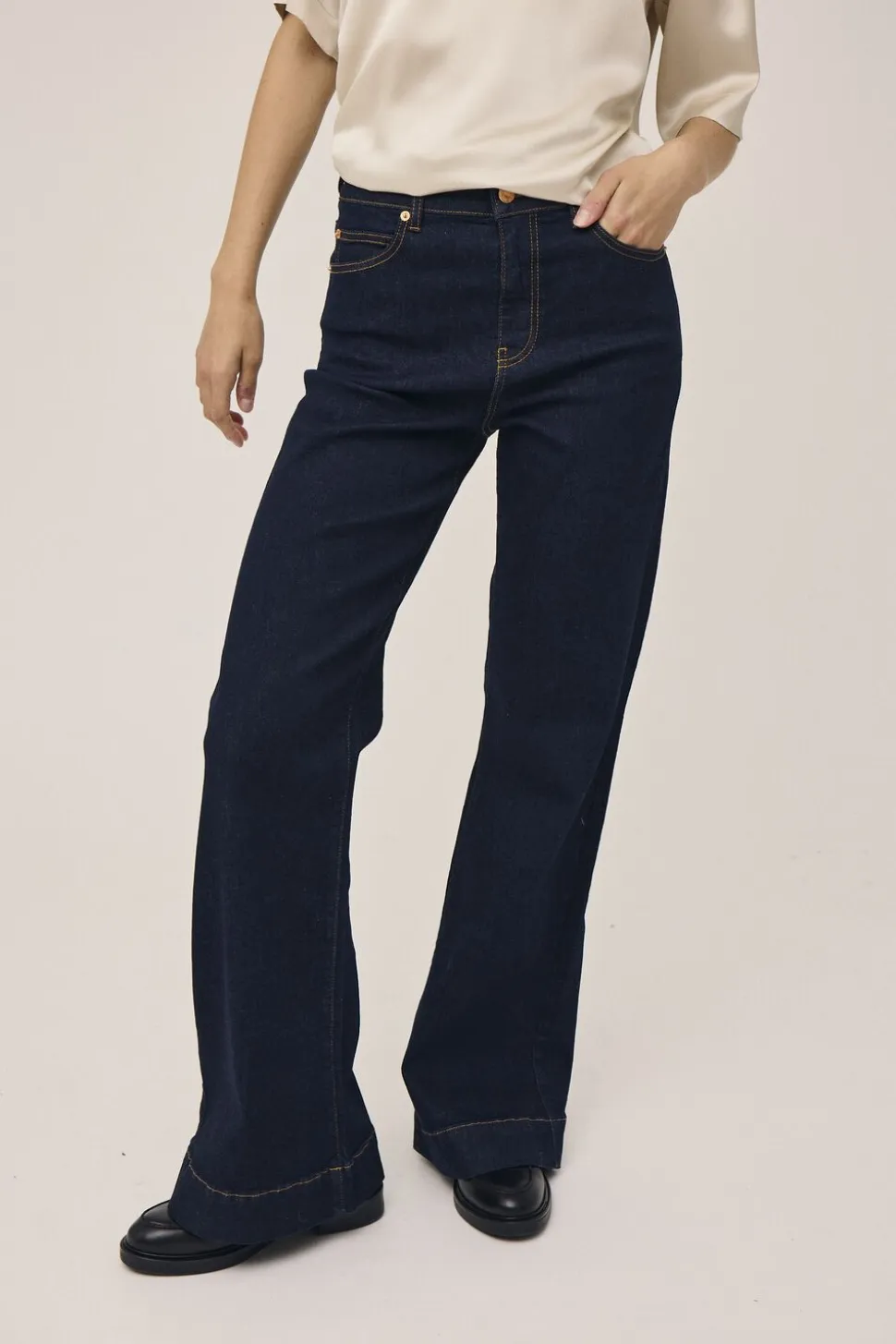 Jeans fra Magasin du Nord Collection i den blødeste kvalitet af 99% økologisk bomuld med GOTS-certificering. Bukserne er en klassisk ‘5 pocket’-model med knap- og lynlåslukning, en høj talje samt bukseben med vidde. Et par skønne bukser i en lækker kvalitet.