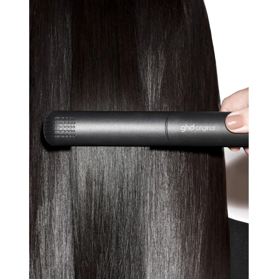 ghd Original glattejern er en essentiel stylingmaskine, der er designet til at levere professionelle resultater i dit eget hjem. Dette glattejern er i en elegant sort farve, der passer ind i enhver skønhedsrutine. Det er udstyret med den nyeste single-zone-keramiske teknologi, som opretholder den optimale stylingtemperatur på 185°C. Denne temperatur er ideel for at sikre, at dit hår bliver stylet effektivt uden at blive udsat for ekstrem varme, hvilket kan skade håret. ghd Original er perfekt til alle hårtyper og kan bruges til at skabe forskellige looks, fra glatte frisurer til bløde bølger og spændstige krøller. De ikoniske gyldne svævende plader har en glat, blank overflade, der giver en strålende finish og sikrer, at håret glider let igennem. Med afrundede kanter er det nemt at skabe de ønskede frisurer uden besvær. Dette glattejern er ideelt til daglig brug og kan hurtigt blive en uundgåelig del af din skønhedsrutine. Uanset om du skal til en fest, på arbejde eller blot ønsker at se godt ud til hverdag, vil ghd Original glattejern hjælpe dig med at opnå det ønskede look. Det er en pålidelig og holdbar stylingmaskine, der leverer resultater, du kan stole på. Oplev den forskel, ghd Original kan gøre for dit hår og din stil.