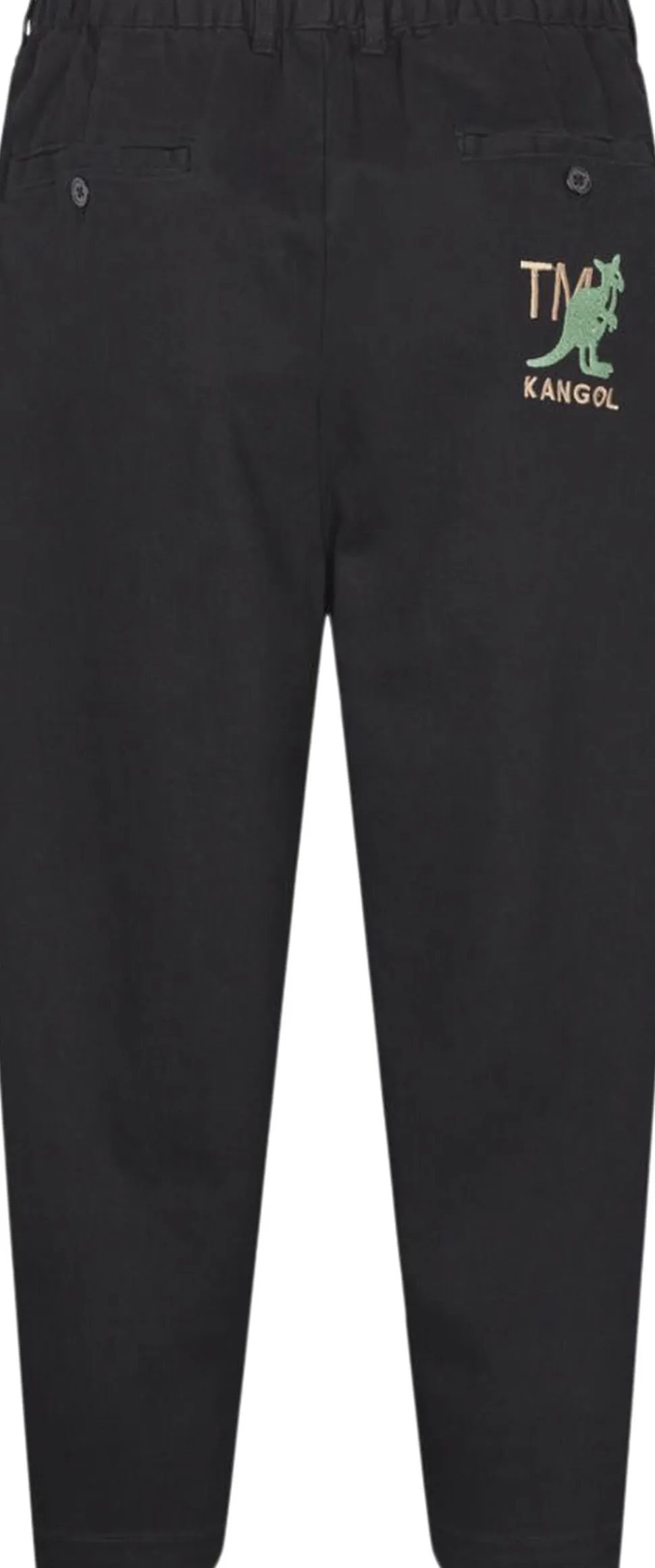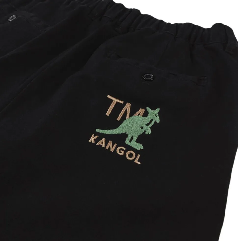 Modellen er løs hele vejen ned gennem benene, i livet er der kommet elastik, så de er behagelige at have på. Dertil finder du et større Kangol logo på højre baglomme.