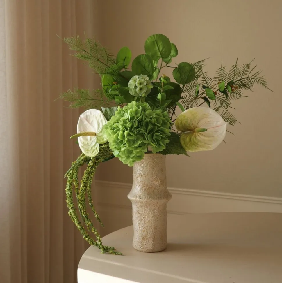 Denne buket indeholder en harmonisk blanding af bløde grønne og naturlige teksturer, der skaber en frisk og fredfyldt sammensætning. Svampehydrangeablomster tilføjer fylde, mens skulpturelle anthurier og delikate frøplanter introducerer raffinerede detaljer. Flowing amaranthus og luftige bregner bringer bevægelse, suppleret med struktureret løv til dybde. Denne buket indeholder i alt 10 stilke. Bourquetten når en højde på 85 cm på sit højeste punkt, men alle stilke kan let bøjes og justeres for at opnå den ønskede højde og form til ethvert arrangement. Den store keramiske jordvase på billedet måler 30,5 cm i højden og 10 cm i diameter.