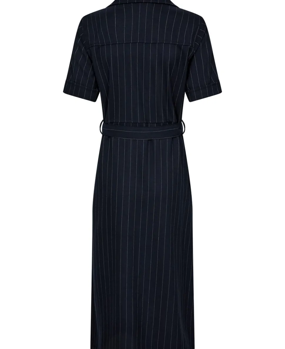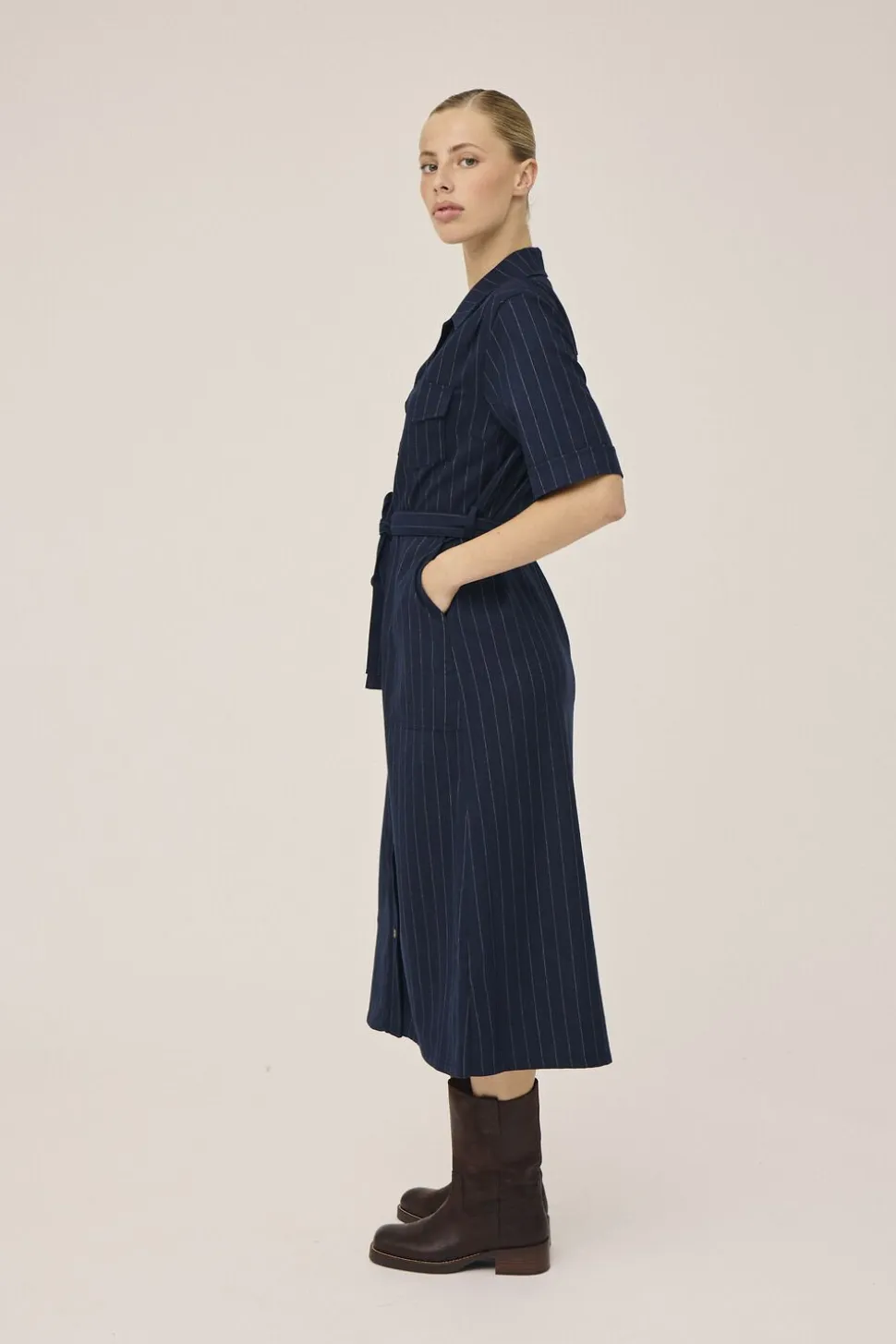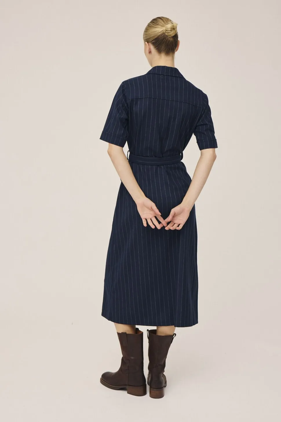 Skjortekjole fra Magasin du Nord Collection i den lækreste kvalitet af 63% genanvendte fibre med GRS-certificering. Kjolen har et fint, nålestribet print, hornknapper på fronten, korte ærmer, en åben krave, brystlomme, sidelommer samt et bindebånd i taljen. En skøn skjortekjole i en lækker kvalitet.