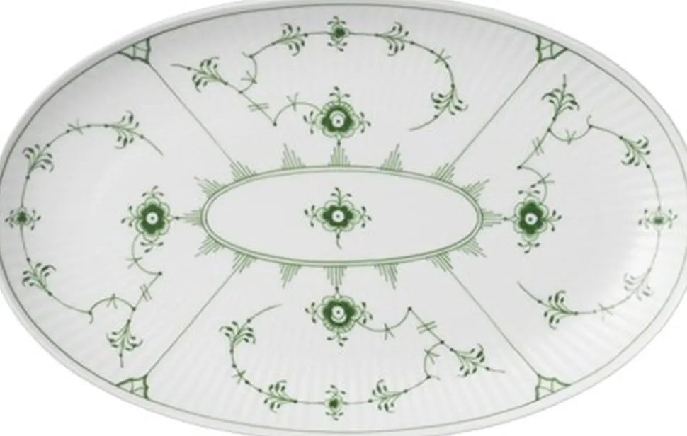 Tilfør borddækningen det lille ekstra med Grøn Musselmalet Riflet asiet, perfekt til servering af brød eller mindre anretninger. Det ikoniske mønster og den dybe grønne farve forenes i et udtryk, der både hylder tradition og bringer en moderne lethed til bordet.
