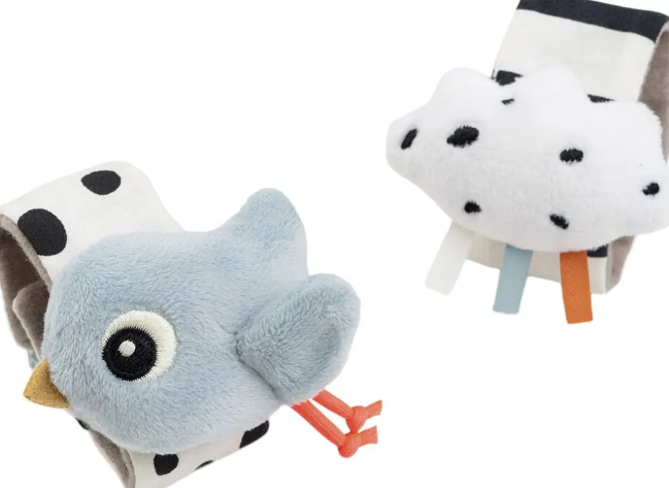 Happy clouds håndledsrangler består af 2 bløde babyarmbånd med blå detaljer