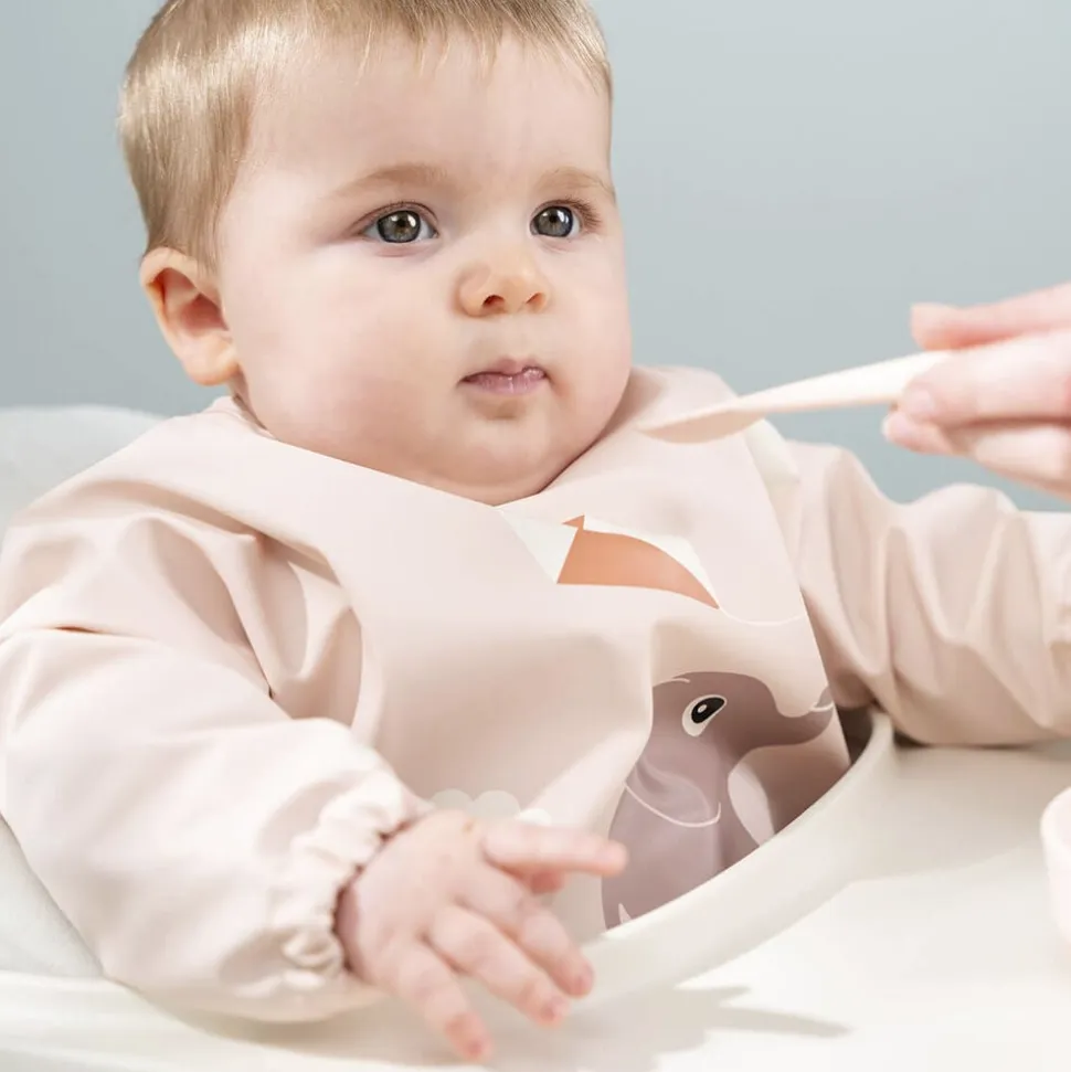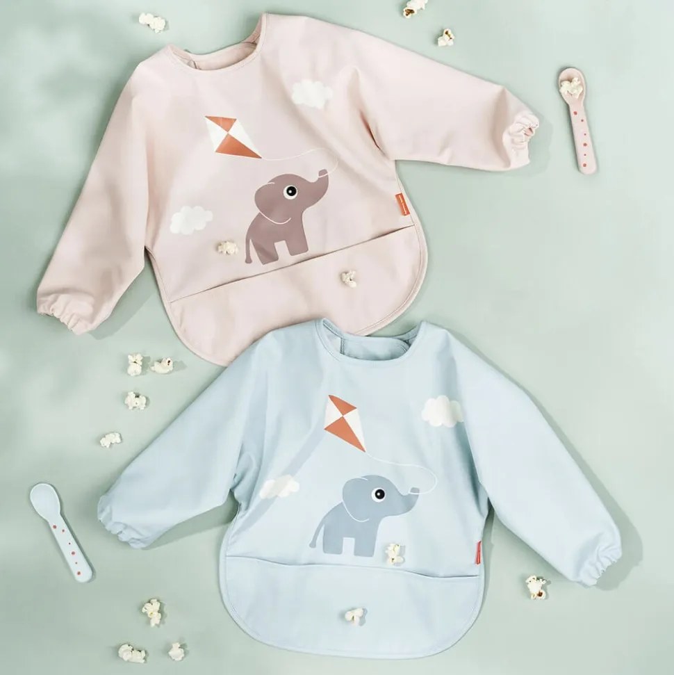 Sød, pudderfarvet hagesmæk med motiv af Elphee, der flyver med drage