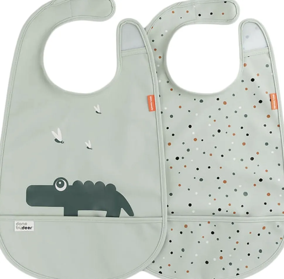 Din Deer friend er klar til at gøre spisetid lidt mindre rodet med dette praktiske sæt af to vandtætte hagesmække med Velcro-lukning. De er nemme at tørre af og den smarte lomme fanger den mad der ryger ved siden af og sparer dig en masse rengøringstid. De bløde hagesmække har en smart Velcro-lukning, der gør dem nemme at tage af og på. Det søde sæt består af to hagesmække, den ene i en lys, grøn nuance dekoreret med Croco og ildfluer og Happy dots i forskellige, lyse farver på den anden.