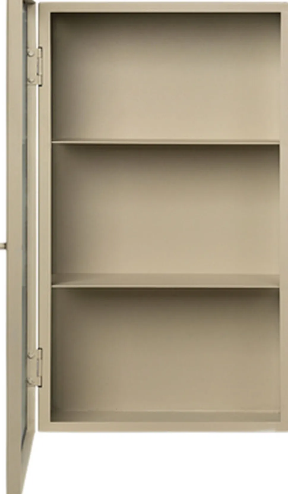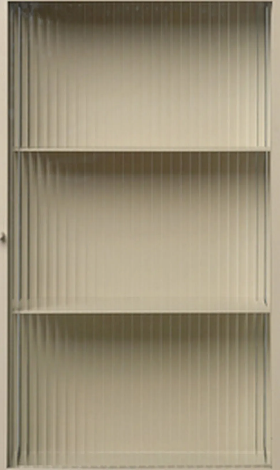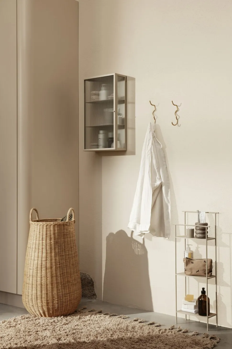 Haze-vægskabet har den samme industrielle æstetik som vores Haze-vitrineskab, og er, som navnet antyder, et praktisk vægmonteret skab til opbevaring af mindre genstande. Det er udformet i pulverlakeret stål i en blød kashmirfarvet nuance og udstyret med elegante rillede glaspaneler og en dør, og er den ideelle løsning til opbevaring af briller i køkkenet eller skønhedsprodukter i badeværelset. Det fungerer også særdeles godt i en gang fyldt med ting til hverdagsbrug, såsom nøgler og solbriller.