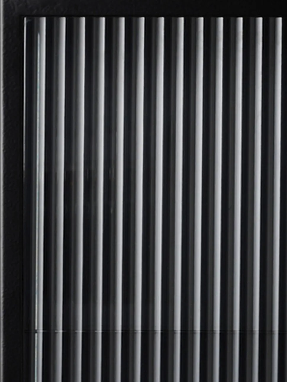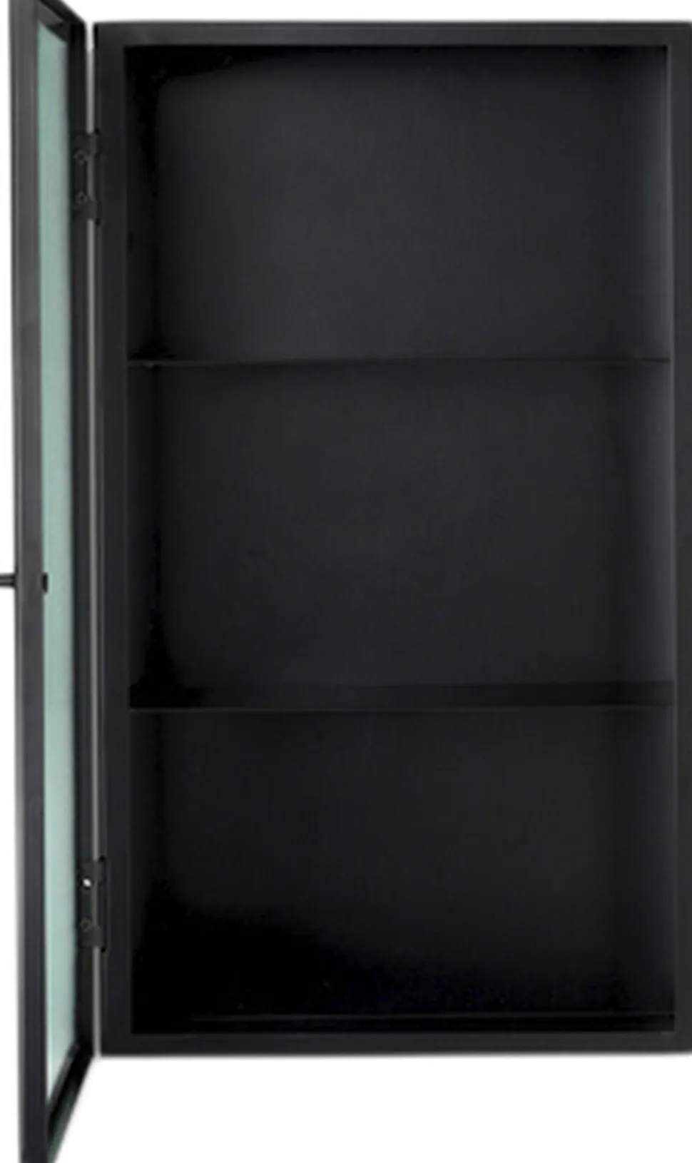 Haze-vægskabet har den samme industrielle æstetik som vores Haze-vitrineskab, og er, som navnet antyder, et praktisk vægmonteret skab til opbevaring af mindre genstande. Det sorte pulverlakerede stålstel fås nu med elegante rillede glaspartier og låge og er den ideelle løsning til opbevaring af glas i køkkenet eller af skønhedsartikler på badeværelset. Det fungerer også særdeles godt i en entré fyldt med ting til hverdagsbrug såsom nøgler og solbriller.