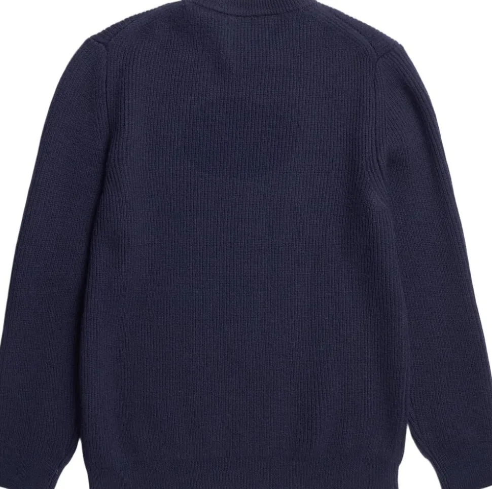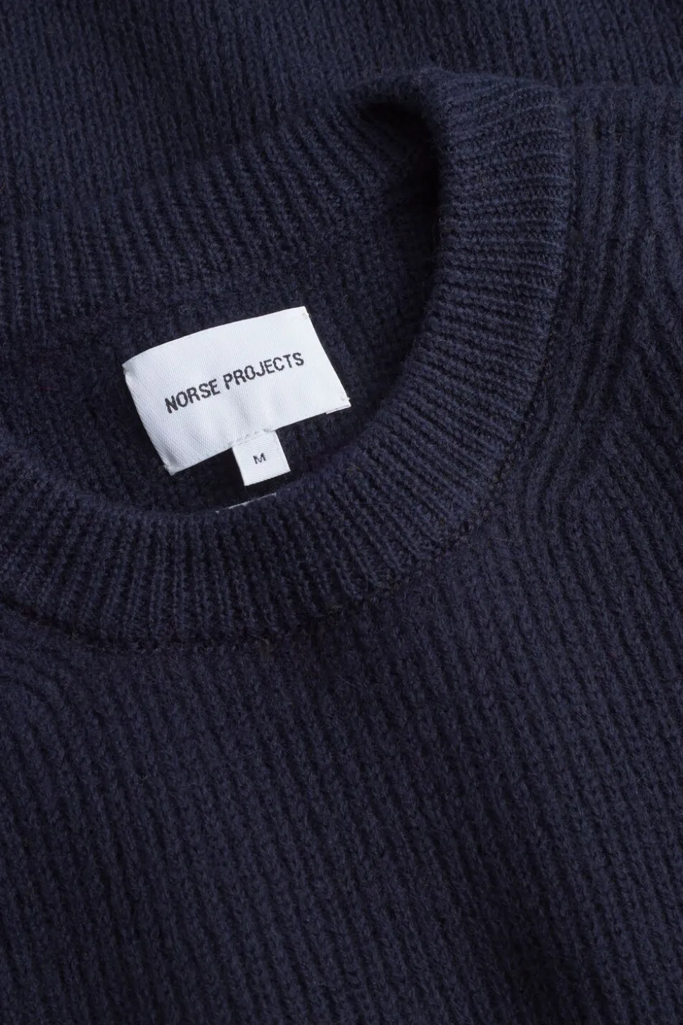 Rund hals med almindelig pasform i en vaskbar blanding af bomuld og uld. Har indsatte ærmer, ribstrikket hals, manchetter og kant samt en brandet fane ved sømmen.