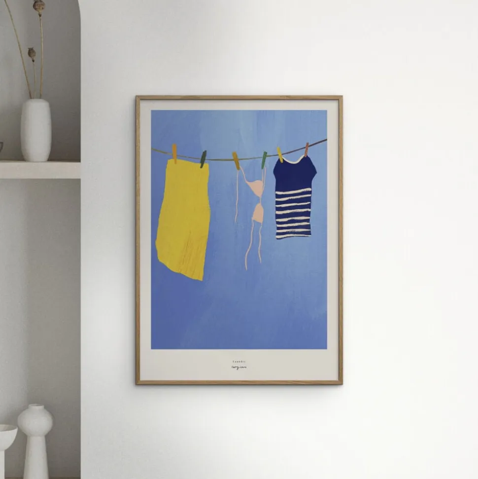 Skab en varm og afslappet sommerstemning i dit hjem med Henry Rivers – Laundry. Denne charmerende plakat fanger et øjeblik af hverdagsro med en minimalistisk skildring af farverige badetøjsstykker og et hndklæde hængende til tørre under en klar, bl himmel. Perfekt til at bringe en følelse af ferie og nostalgi ind i din boligindretning.